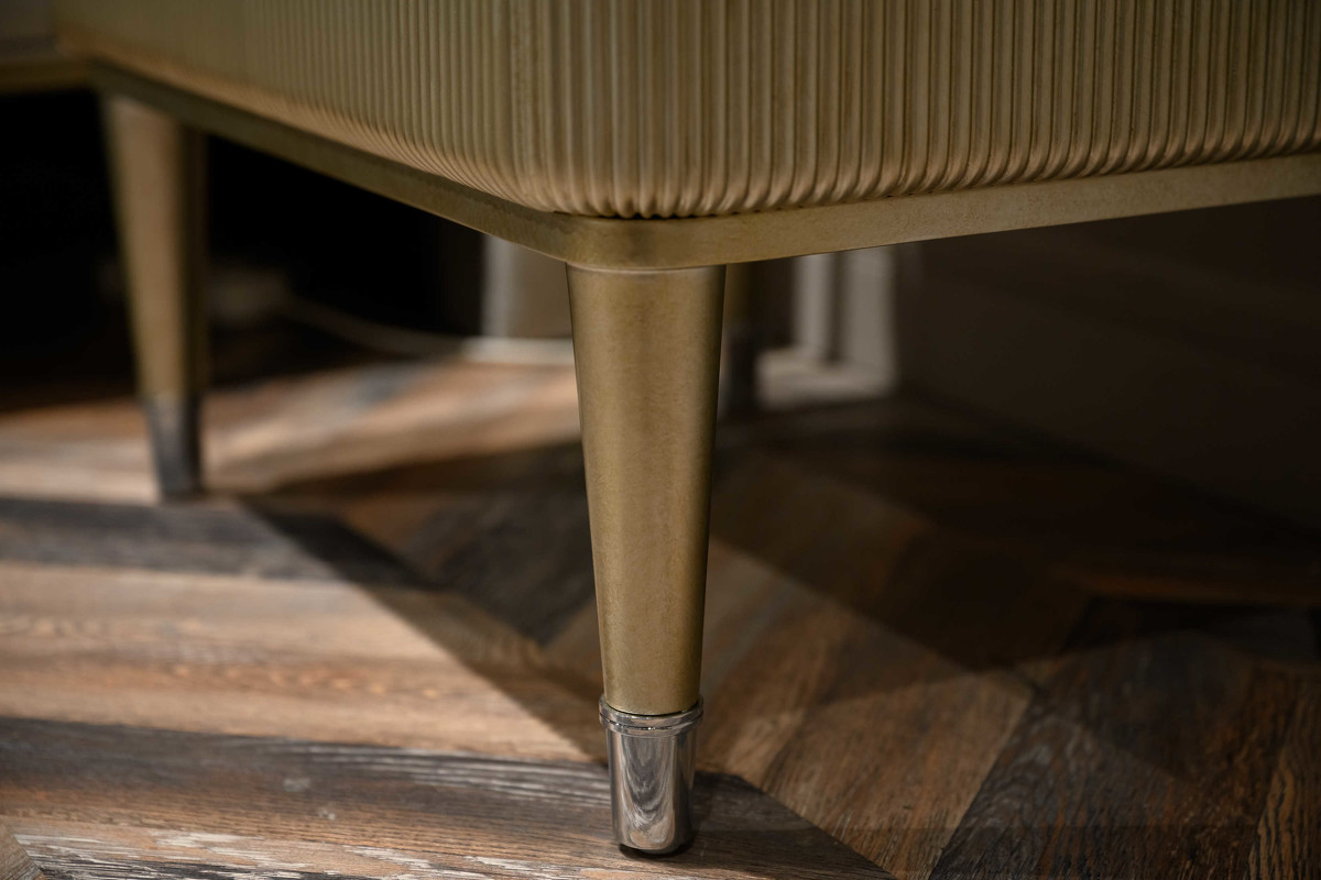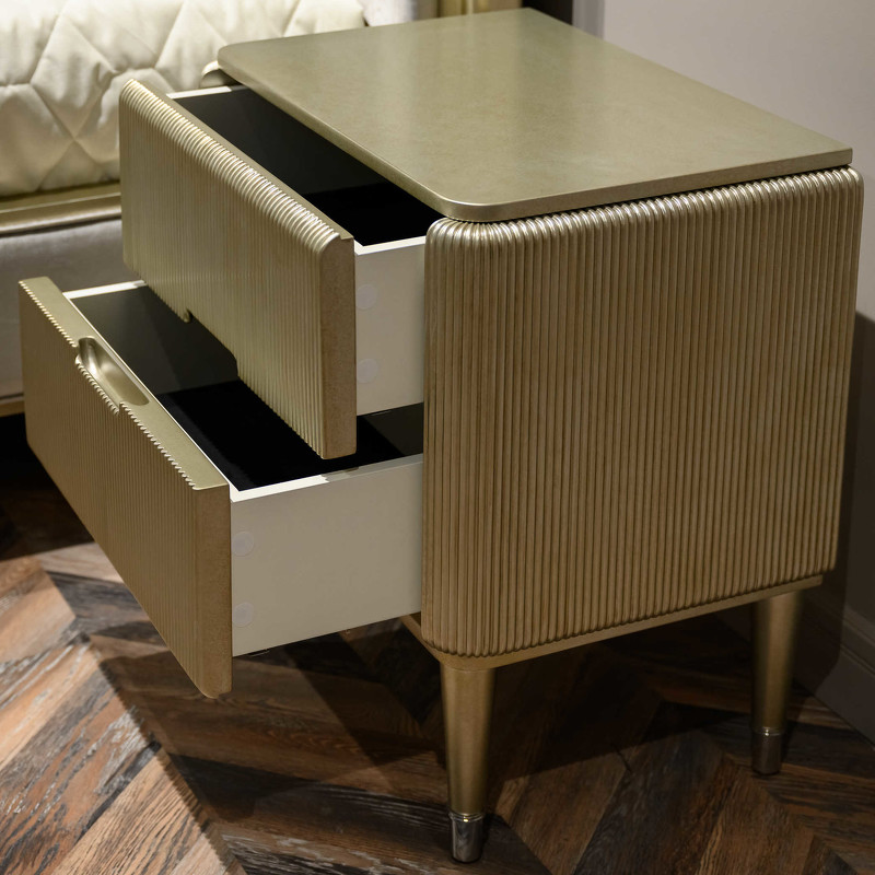 Прикроватная тумбочка от итальянского бренда Fratelli Barri. Закругленная форма и рифленые фасады выглядят очень актуально. Ножки прямые круглые, зауженные к низу. На ножках металлические колпачки. У тумбочки 2 ящика. Ручка - выемка на фасаде. Отделка - лак, цвет - патинированное серебро. Выполнена из массива дерева и высококачественного МДФ класса Е1. Цвет фурнитуры - хром. Ящики оснащены доводчиками для плавного закрывания. Дно ящиков декорировано черной бархатной тканью. Корпус ящиков - белого цвета. Данный предмет является частью коллекции Rimini. Вы можете оформить гостиную, столовую, спальню, кабинет и другие комнаты Вашего дома в едином стиле.
