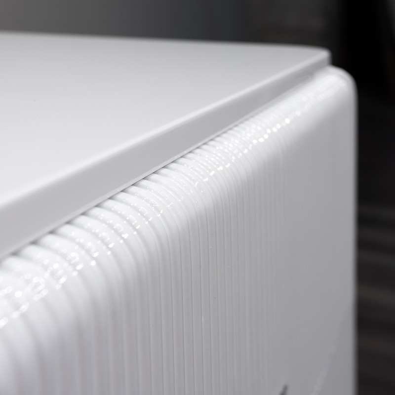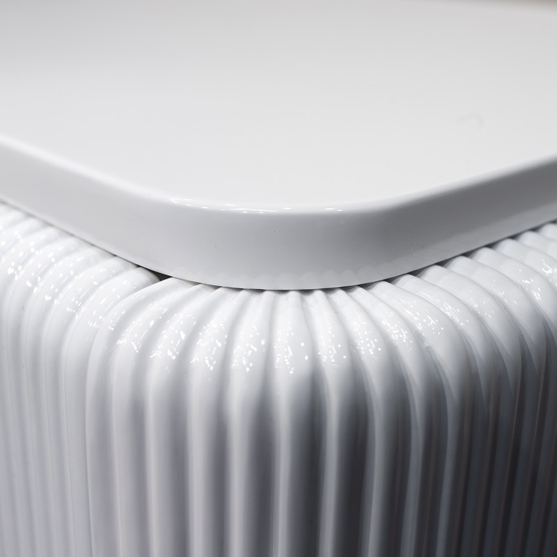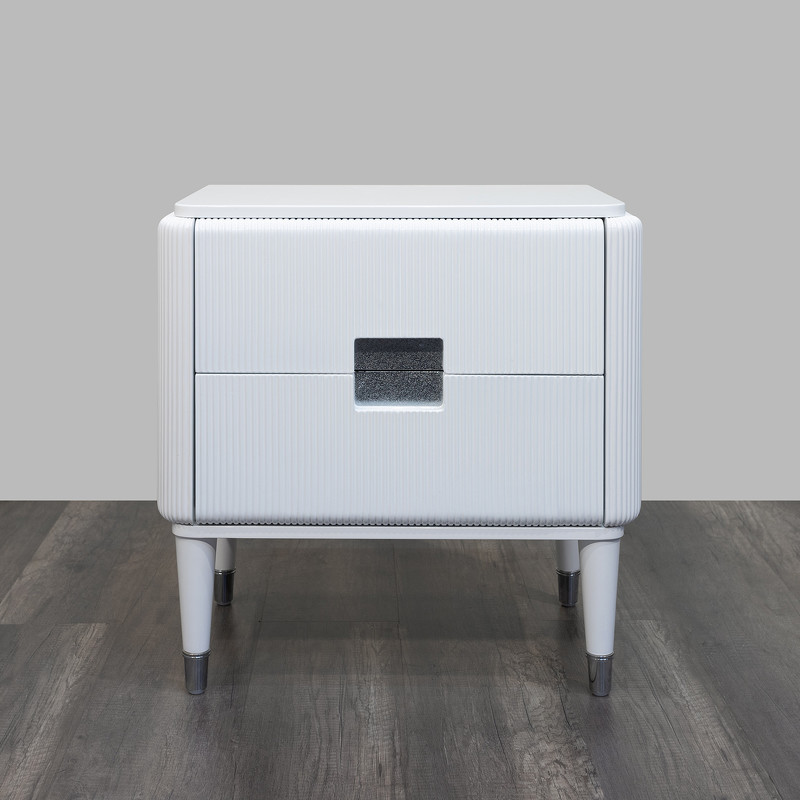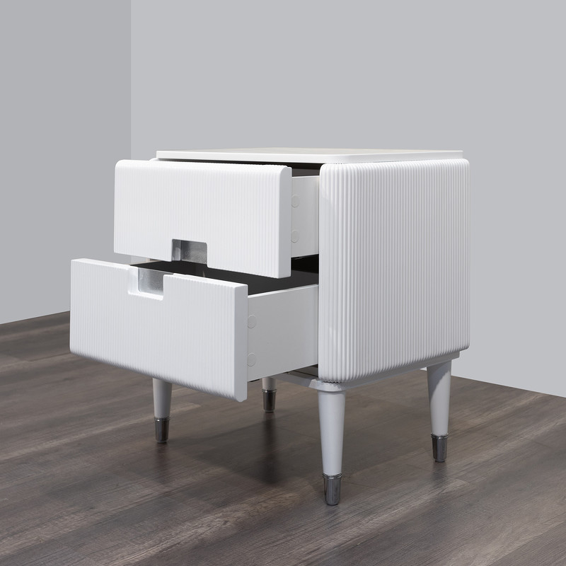 Прикроватная тумбочка от итальянского бренда Fratelli Barri. Закругленная форма и рифленые фасады выглядят очень актуально. Ножки прямые круглые, зауженные к низу. На ножках металлические колпачки. У тумбочки 2 ящика. Ручка - выемка на фасаде. Вставка за ручкой - металлическая пластина. Отделка - белый глянцевый лак. Выполнена из массива дерева и высококачественного МДФ класса Е1. Цвет фурнитуры - хром. Ящики оснащены доводчиками для плавного закрывания. Дно ящиков декорировано черной бархатной тканью. Данный предмет является частью коллекции Rimini. Вы можете оформить гостиную, столовую, спальню, кабинет и другие комнаты Вашего дома в едином стиле.