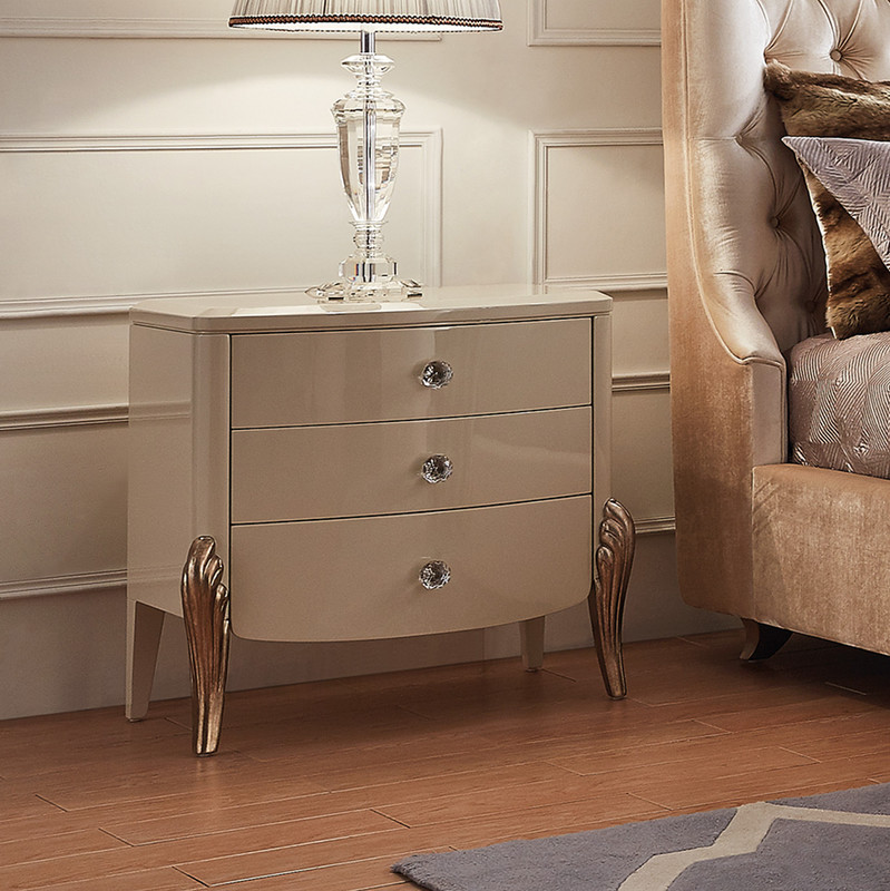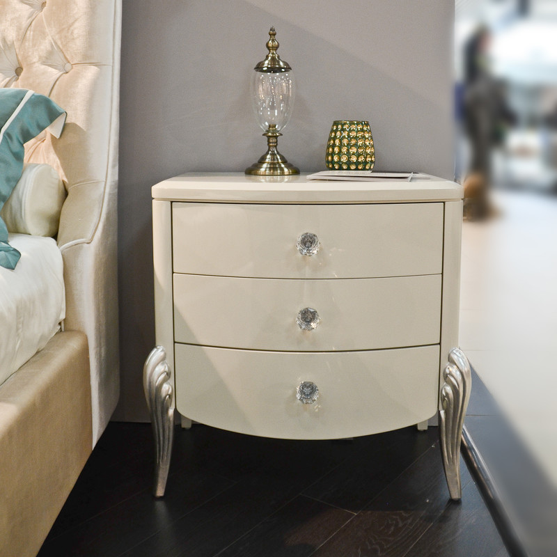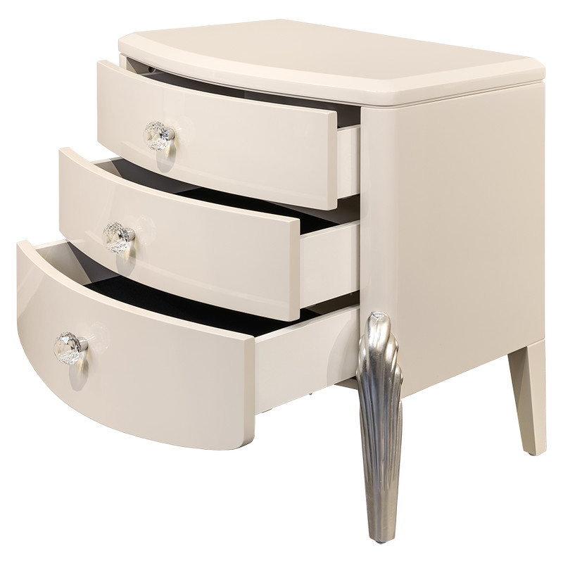 Прикроватная тумбочка на резных ножках выполнена в стиле ар деко. Оснащена тремя выдвижными ящиками. Ножки покрыты сусальным серебром. Скругленные углы подчеркивают оригинальность модели.