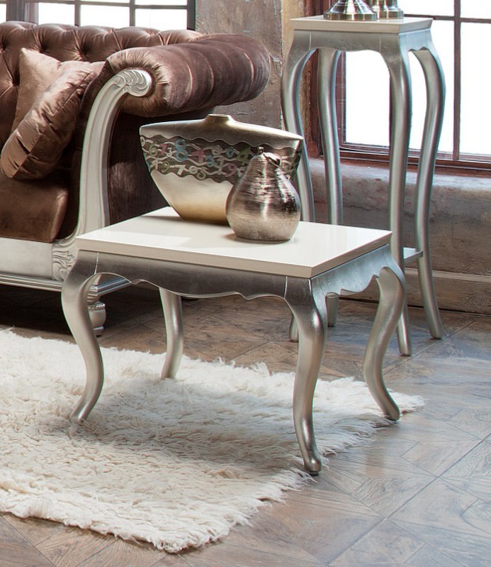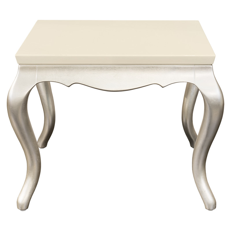 Приставной столик Venezia выполнен в стиле близком к классическому. Сочетание прямого топа и ножек кабриоль придает мебели этой коллекции особенную привлекательность. Топ выполнен из МДФ класса Е1. Ножки и резное подстолье - из массива дерева. Отделка столешницы - перламутровый кремовый лак. Высокие гнутые ножки в отделке сусальное серебро, покрытое лаком шампань - ручное нанесение.