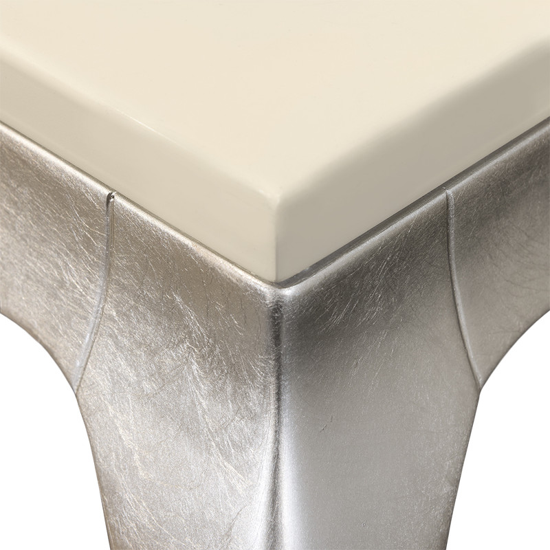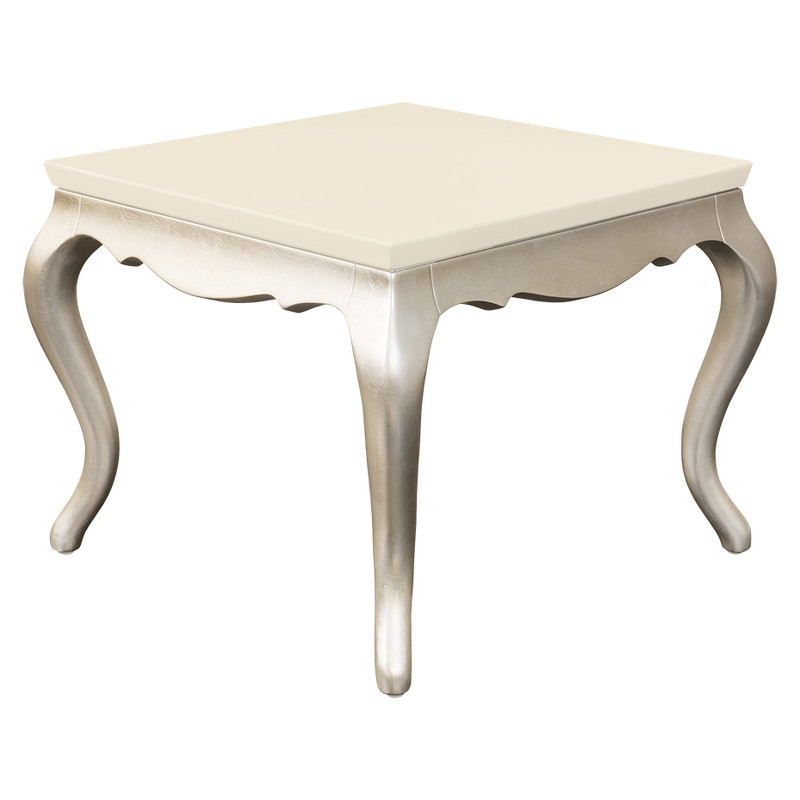 Приставной столик Venezia выполнен в стиле близком к классическому. Сочетание прямого топа и ножек кабриоль придает мебели этой коллекции особенную привлекательность. Топ выполнен из МДФ класса Е1. Ножки и резное подстолье - из массива дерева. Отделка столешницы - перламутровый кремовый лак. Высокие гнутые ножки в отделке сусальное серебро, покрытое лаком шампань - ручное нанесение.