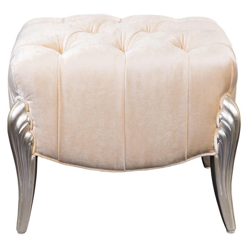 Пуфик на резных ножках выполнен в стиле ар-деко. Сиденье декорировано стежкой капитоне. Ножки покрыты сусальным серебром.