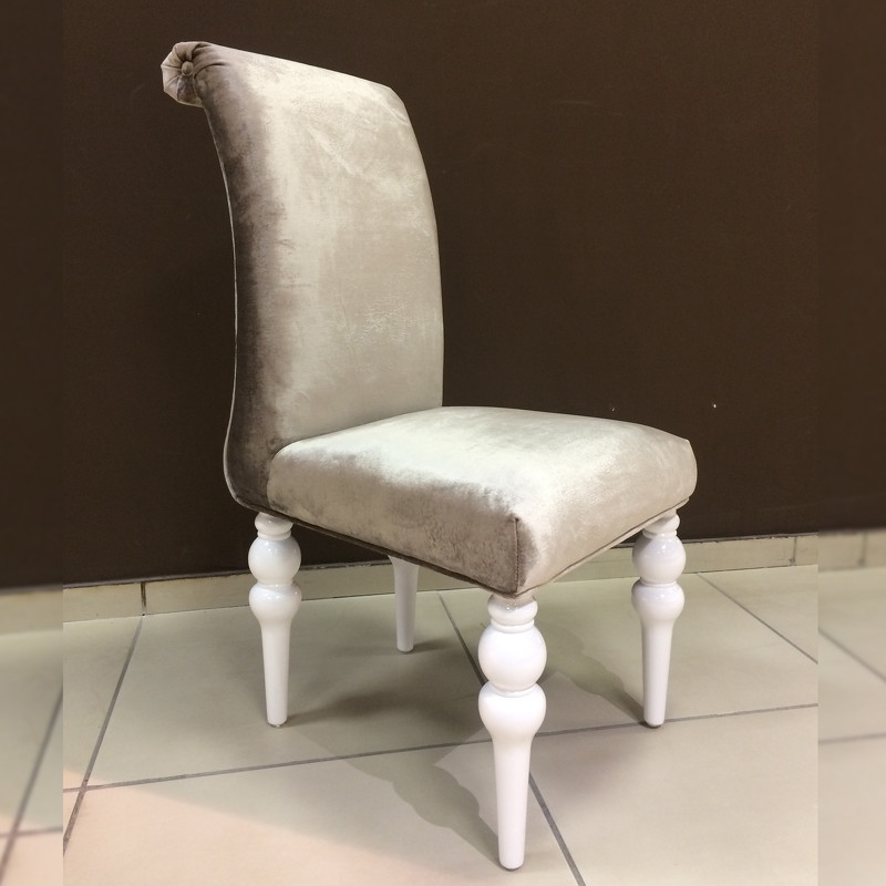 Стул с изогнутой спинкой из массива дерева. Фигурные ножки в отделке из коллекции фабрики. Обивка — ткань из коллекции фабрики.