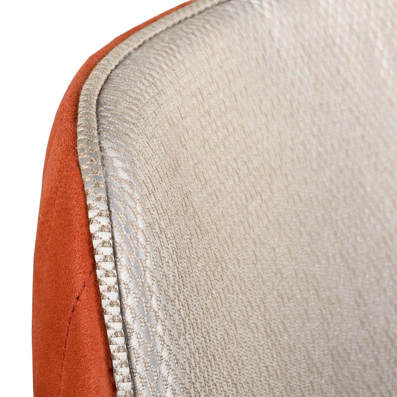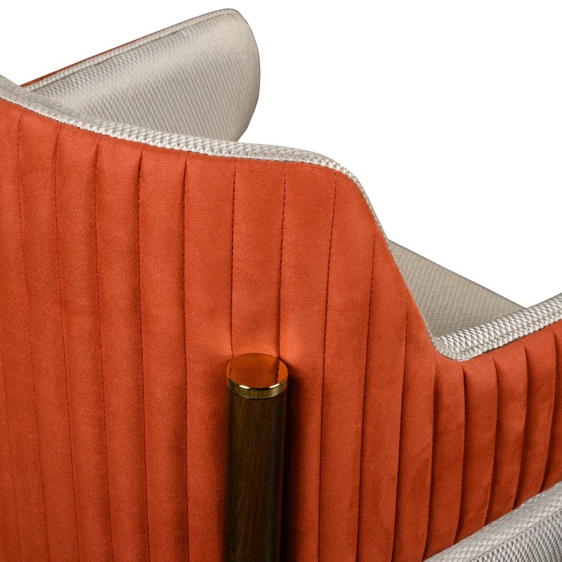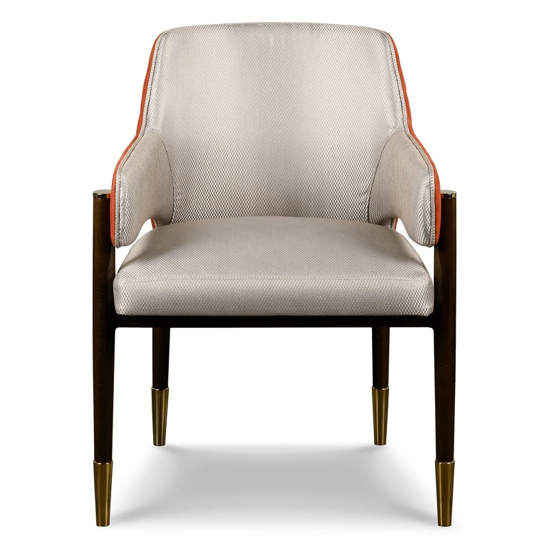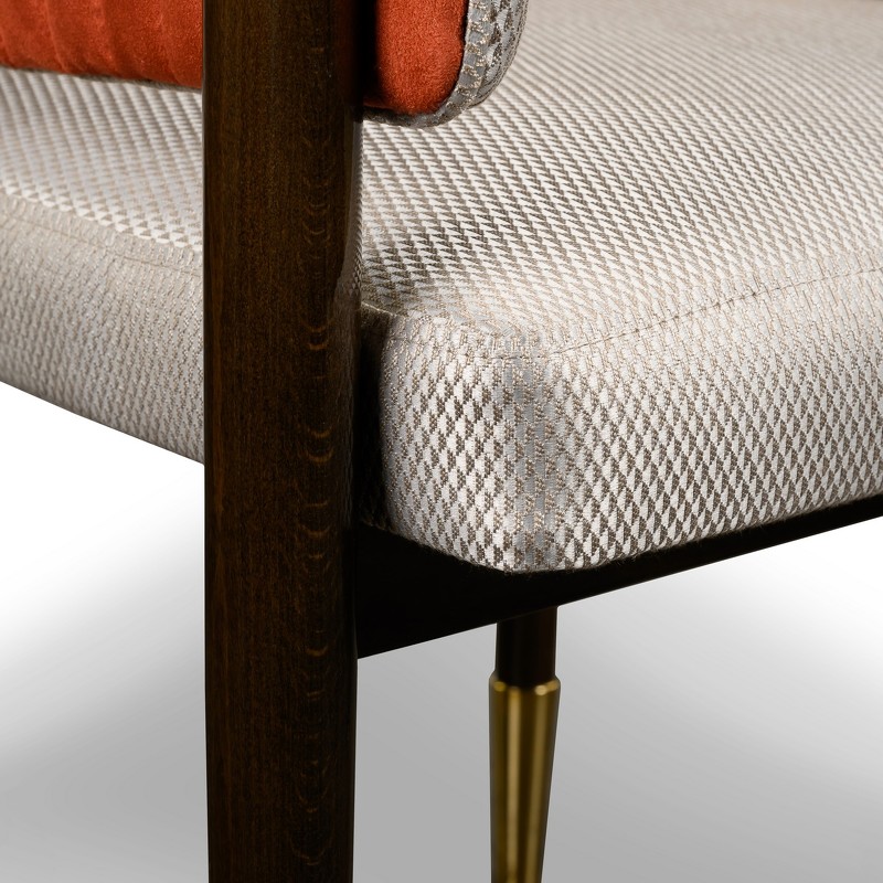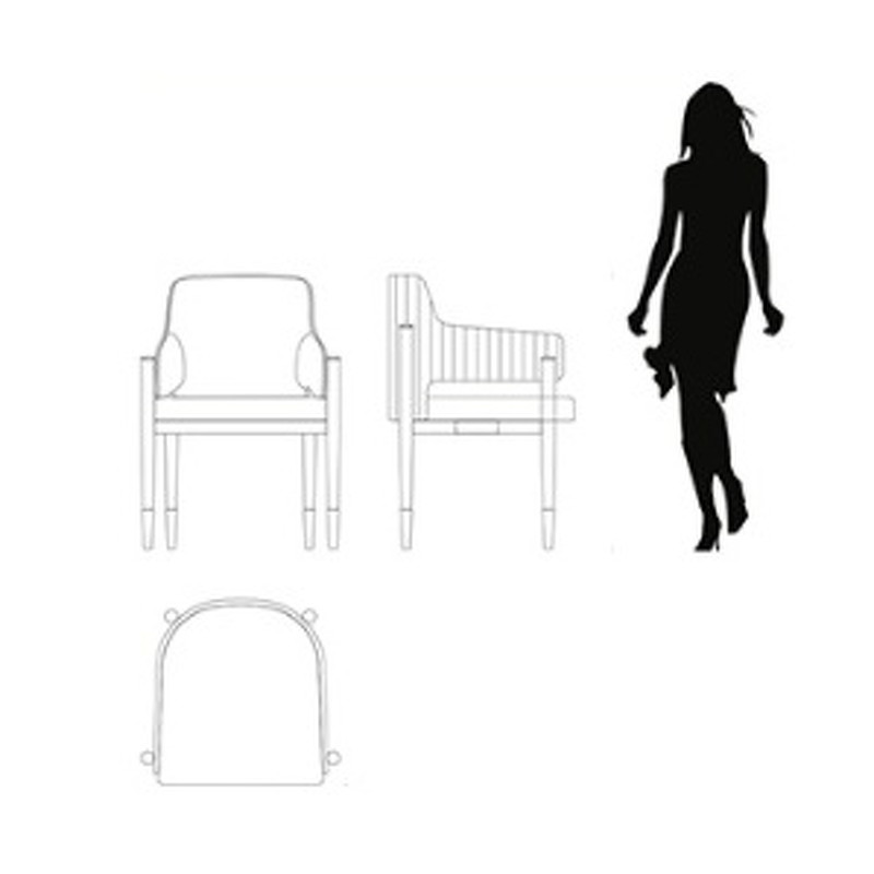 Стул с подлокотниками выполнен в стиле ар-деко. Каркас изготовлен из массива бука. Ножки с металлическими колпачками. Мягкое сидение и спинка обиты тканью из ассортимента фабрики. У фабрики представлены ткани широкой палитры оттенков производства Италия, Испания, Бельгия и Турция. Спинка декорирована вертикальной стежкой.