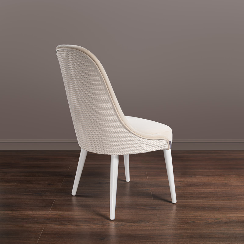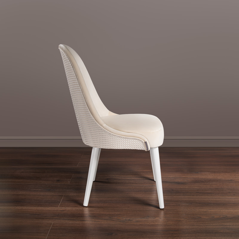 Стул от фабрики Fratelli Barri выполнен в современном стиле. Ножки выполнены из массива бука в отделке белый глянцевый лак. Материал обивки: ткань сидения и внутренней спинки Paddington 27, ткань внешней спинки Rich 14. Коллекция ткани Paddington состоит из модифицированного полиэстера, что позволяет волокнам пропускать свет и создавать перламутровый эффект, напоминающий натуральный жемчуг. Ткань износостойкая и долговечная за счет плотного ворса. Тип ткани: микровелюр. Состав: 100% полиэстер. Наполнение: ППУ повышенной износостойкости.