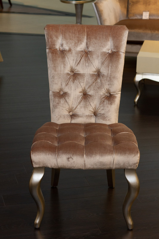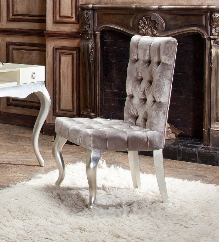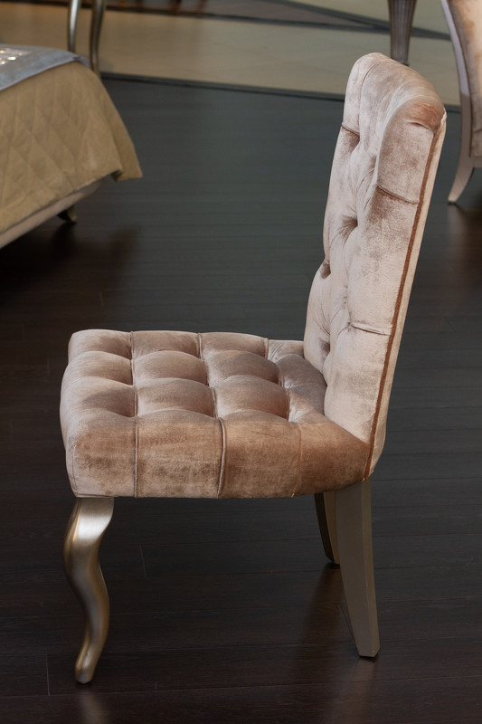 Стул Venezia выполнен в стиле близком к классическому. Широкое сидение и высокая спинка обеспечивает комфортную посадку. Структура стула из массива дерева. Наполнение сидения и спинки из пенополиуретана высокой плотности. Ножки в отделке сусальное серебро, покрытое лаком шампань - ручное нанесение. Сиденье и спинка обиты бежевым велюром и декорированы стежкой капитоне с пуговицами в этой же ткани. Обивка из велюра бархатистая, очень приятная на ощупь.