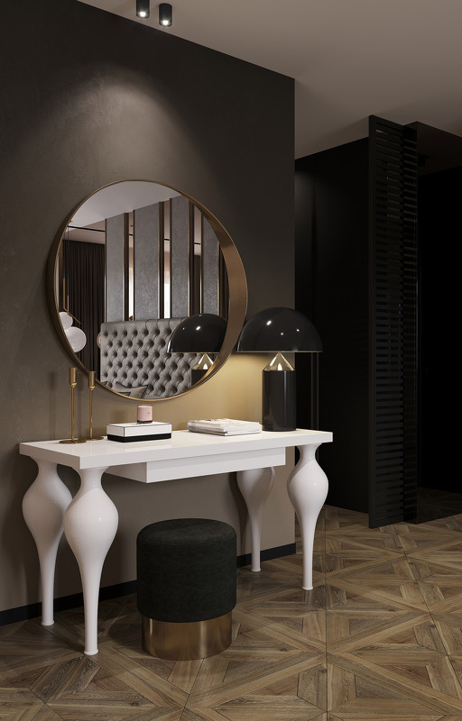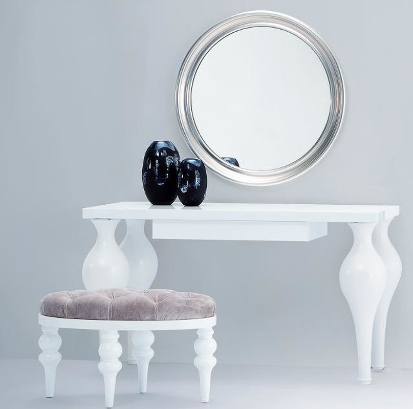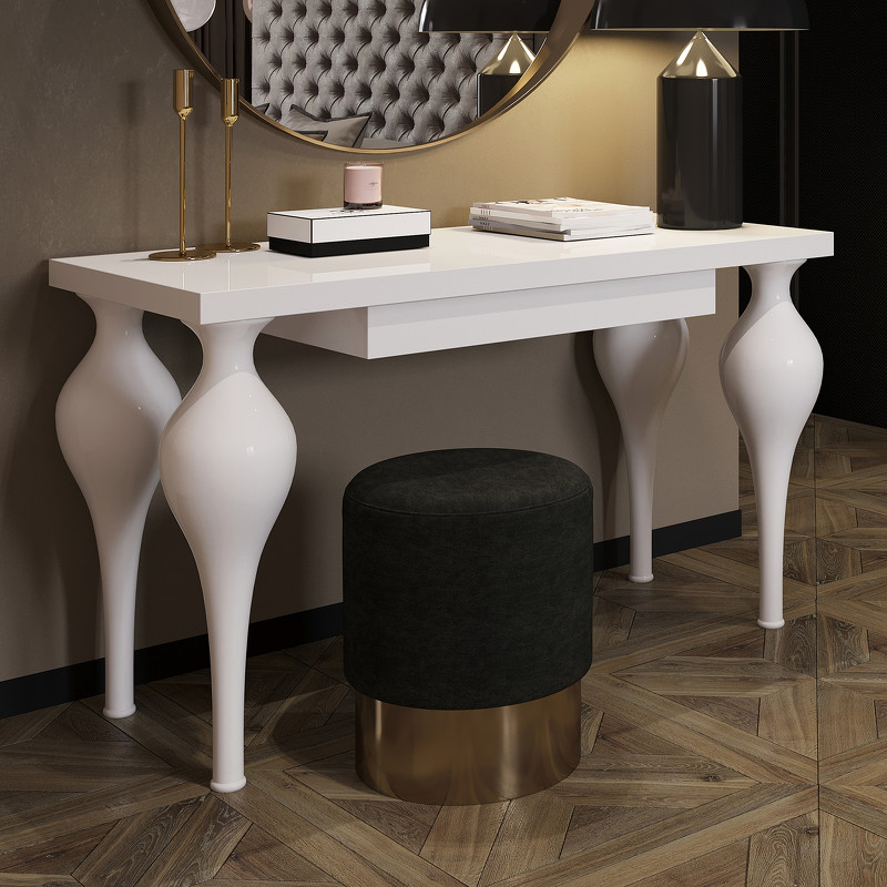 Туалетный стол выполнен в стиле Ар деко. Отделка белый блестящий лак. Оснащен 1 выдвижным ящиком. Туалетный столик просто верх изящества! Согласитесь: несмотря на его приличные размеры, он создаёт атмосферу невесомости. Поскольку площадь туалетного столика достаточно велика, он может служить компактным письменным столом для владельца. Сделан из высококачественного МДФ высокой плотности и массива дерева. Ножки из массива гевеи и полимерной смолы.