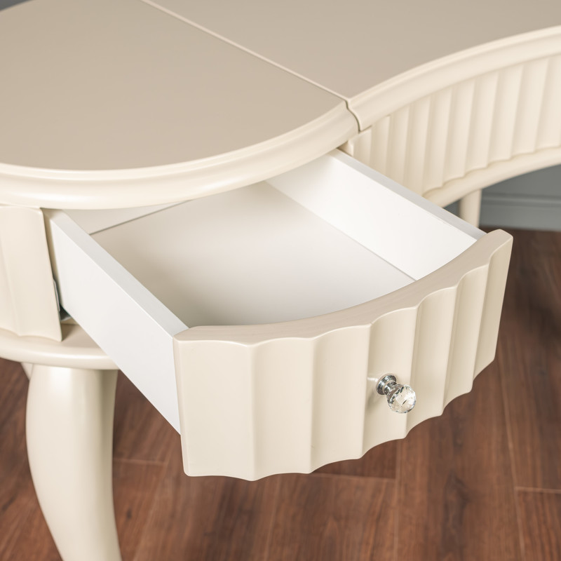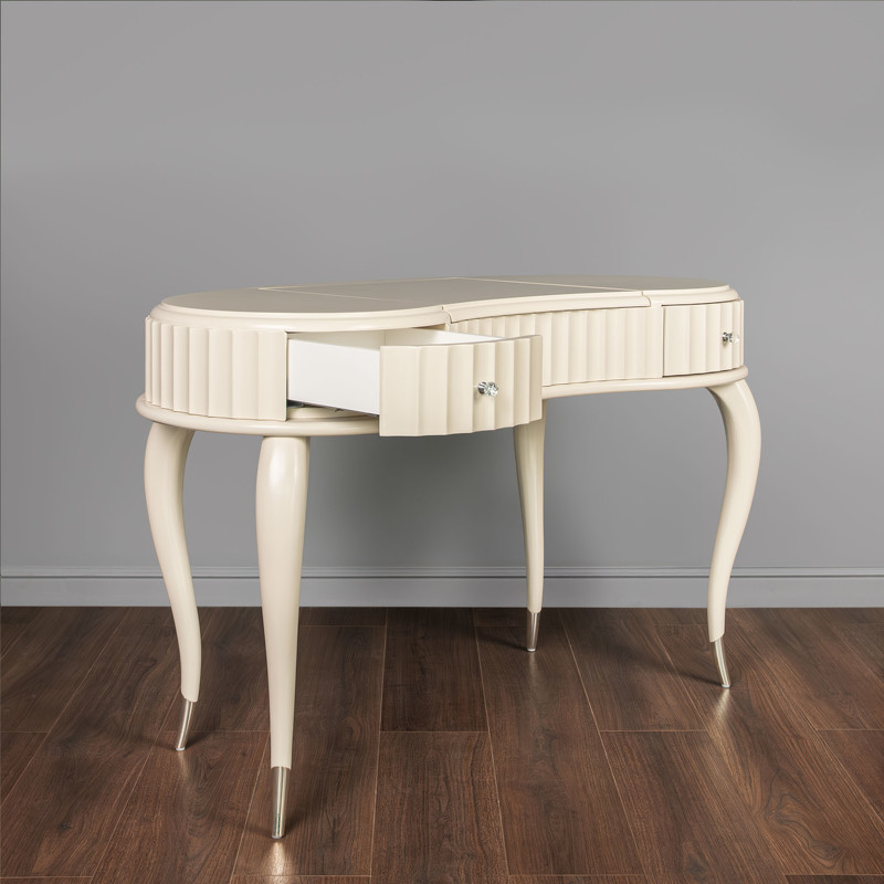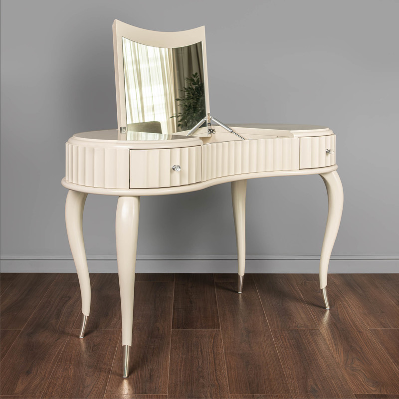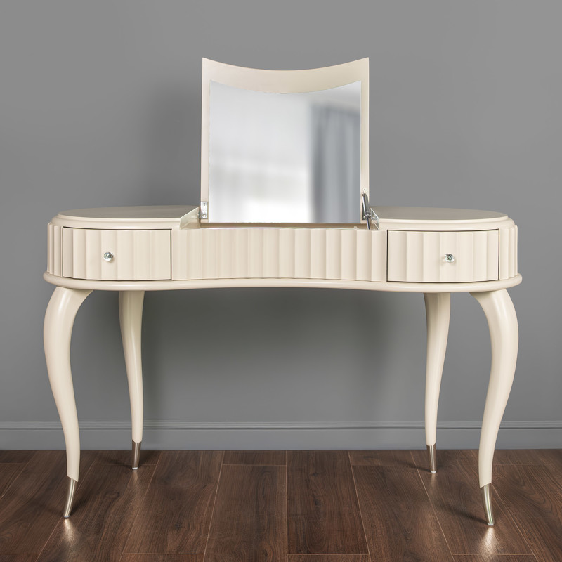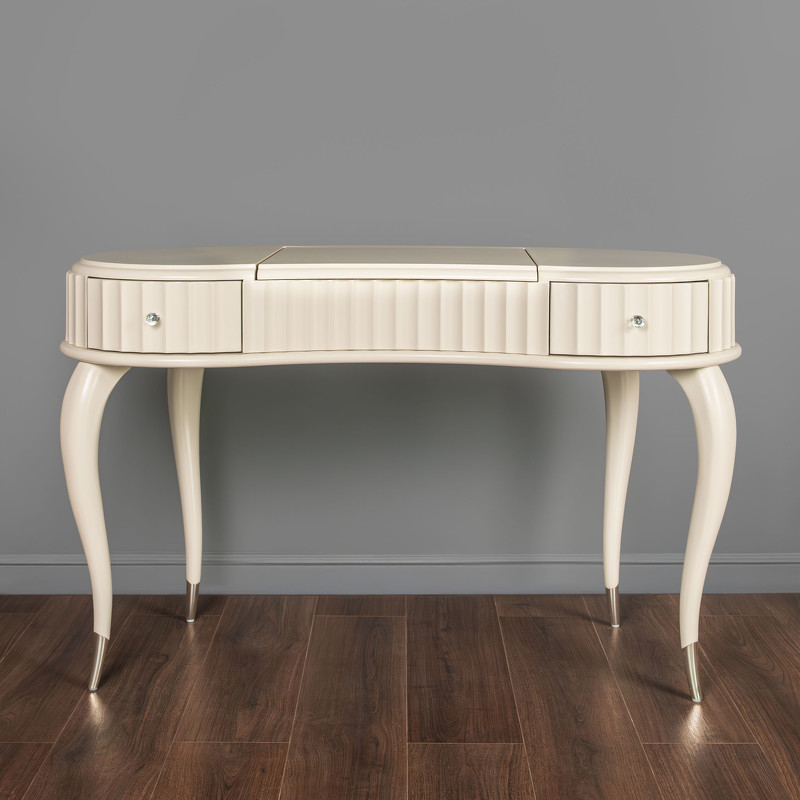 Изящный туалетный столик от итальянского бренда Fratelli Barri на объемных изогнутых ножках и с модным рифленым фасадом. Модель выполнена в стиле неоклассика с оттенком ар-деко. Форма столика "фасоль". Столик изготовлен из массива дерева и высококачественного МДФ высокой плотности. Модель оснащена 2 выдвижными ящиками и отделением с подъемной крышкой и зеркалом. Ножки из массива дерева с металлическими наконечниками. Цвет фурнитуры - хром. Данный предмет является частью коллекции Rimini. В этом же дизайне у нас Вы найдете весь комплект мебели для спальни.