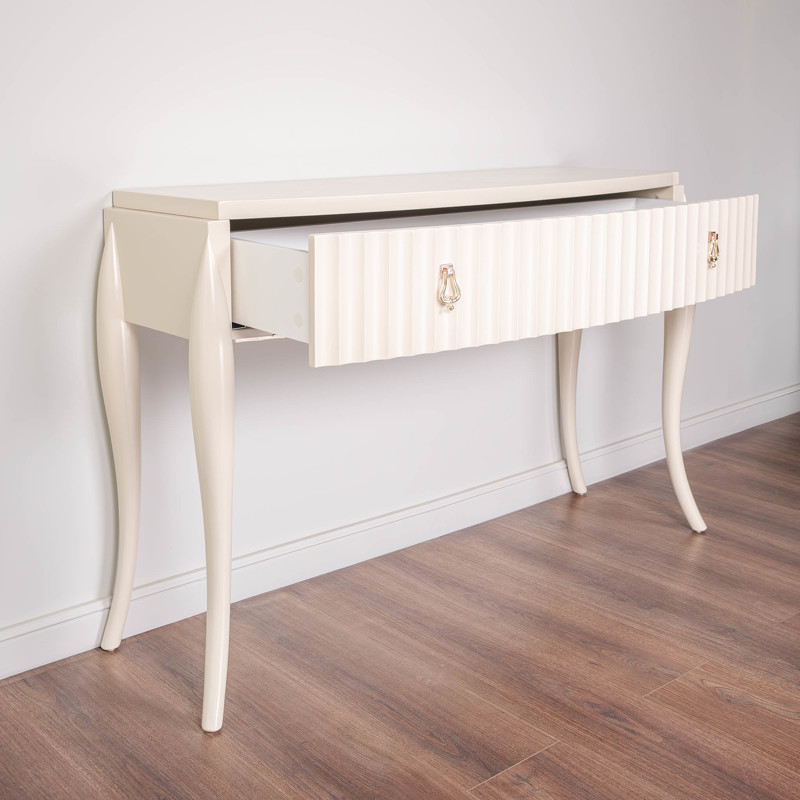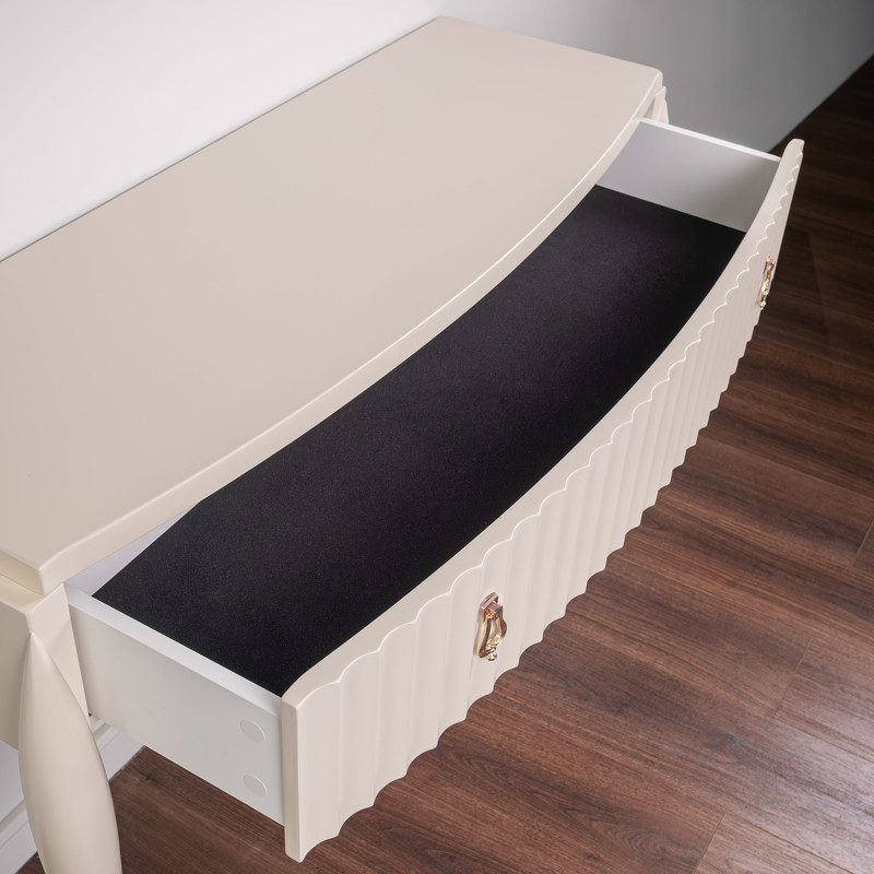 Элегантный туалетный столик от итальянского бренда Fratelli Barri на объемных изогнутых ножках и с модным рифленым фасадом. Модель выполнена в стиле неоклассика с оттенком ар-деко. Выпуклый слегка фасад придает мягкости линий столика. Отделка - бежевый матовый лак. Изготовлен из массива дерева и высококачественной МДФ высокой плотности. Модель оснащена одним вместительным ящиком со скрытыми направляющими. Ящик оснащен доводчиками для плавного закрывания. Дно ящиков декорировано черной бархатной тканью. Корпус ящика белого цвета. Цвет фурнитуры - хром.