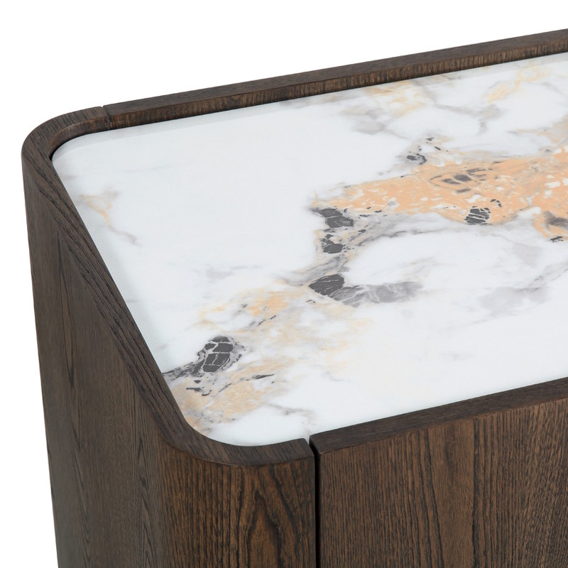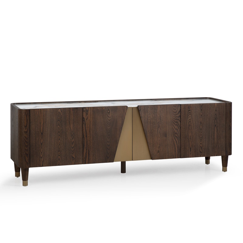 Тумба под TV от бренда Fratelli Barri отлично впишется в современный интерьер. Декоративная вставка по центру тумбы делает предмет ярким и интересным. Тумба интересной закругленной формы, без острых углов, что делает ее максимально комфортной и экологичной. Тумба выполнена из высококачественного МДФ. Отделка - натуральный шпон вяза, тонированный в теплый коричневый цвет. Столешница - керамика в бежевых тонах. Декоративная вставка на фасадах и колпачки на ножках выполнены из матовой нержавеющей стали в цвете латунь. У тумбы 4 распашные дверцы с доводчиками, что обеспечивает их плавное закрывание. Для большей устойчивости тумба оснащена дополнительной ножкой по центру в углублении. Обращаем внимание, что керамическая столешница имеет дизайн под мрамор и всегда неповторима, поэтому рисунок на столешнице может отличаться от фото на сайте.
