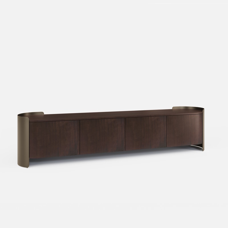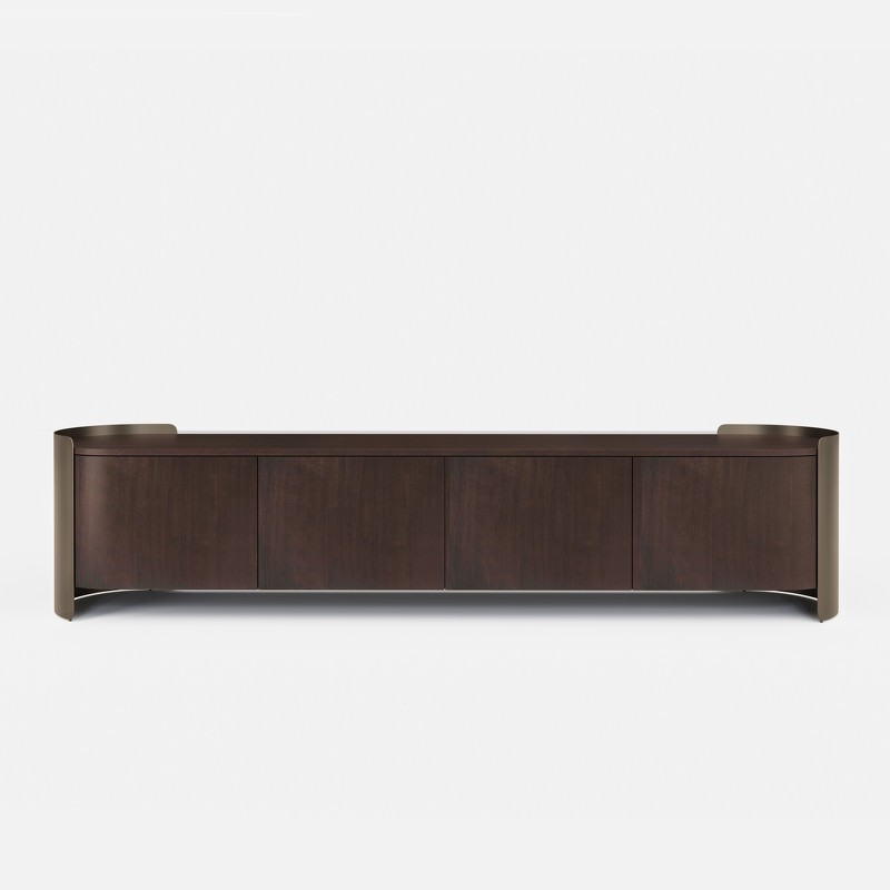 Тумба под TV от бренда Fratelli Barri. Оснащена четырьмя распашными дверцами, где можно комфортно разместить необходимое. Отделка корпуса и столешницы тумбы - дымчатый шпон ореха, декоративная изогнутая часть в цвете матовая латунь W2303.