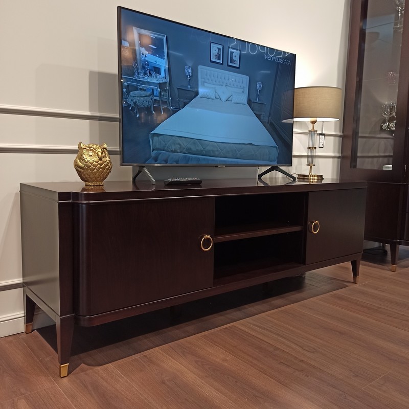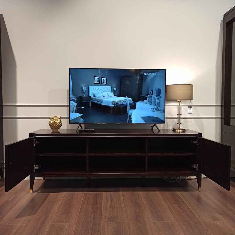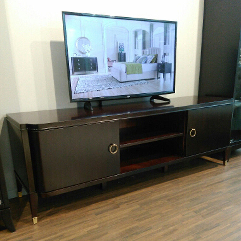 Изящная тумба под ТВ Modena от итальянского бренда Fratelli Barri. Тумба в неоклассическом стиле, с 3-мя отделениями. По центру открытое отделение с полкой, по бокам отделения за дверкой, также с полкой. Закругленные фасады. Отделка - шпон вишни. На ножках металлические колпачки. Выполнен из массива дерева и высококачественного МДФ класса Е1. Цвет фурнитуры - латунь. Отверстия под провода производителем не предусмотрены.