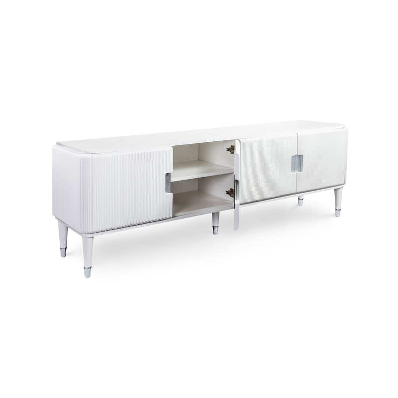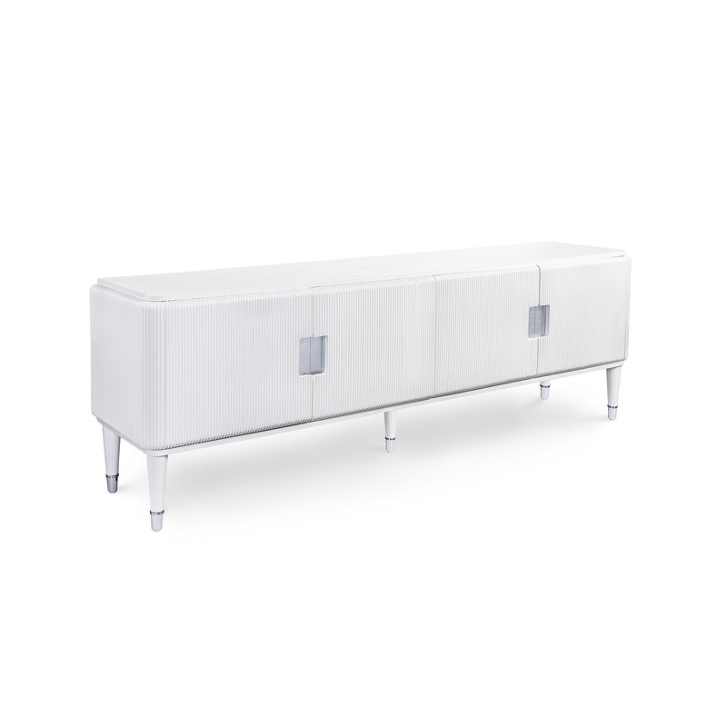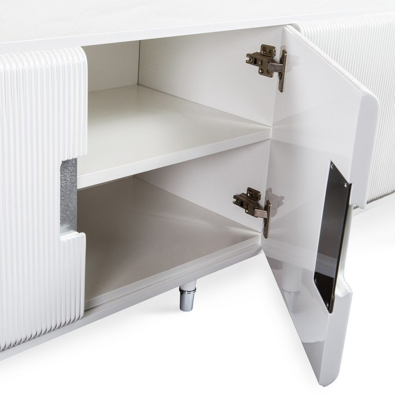 Тумба для телевизора от итальянского бренда Fratelli Barri. Закругленная форма и рифленые фасады выглядят очень актуально. Ножки прямые круглые, зауженные к низу. На ножках металлические колпачки. У тумбы 2 отделения, 4 распашные дверки. В каждом отделении 1 полка. Ручка - выемка на фасаде. Вставка за ручкой - металлическая пластина. Отверстий под провода производителем не предусмотрено. Отделка - белый глянцевый лак. Выполнена из массива дерева и высококачественного МДФ класса Е1. Цвет фурнитуры - хром. Данный предмет является частью коллекции Rimini. Вы можете оформить гостиную, столовую, спальню, кабинет и другие комнаты Вашего дома в едином стиле.