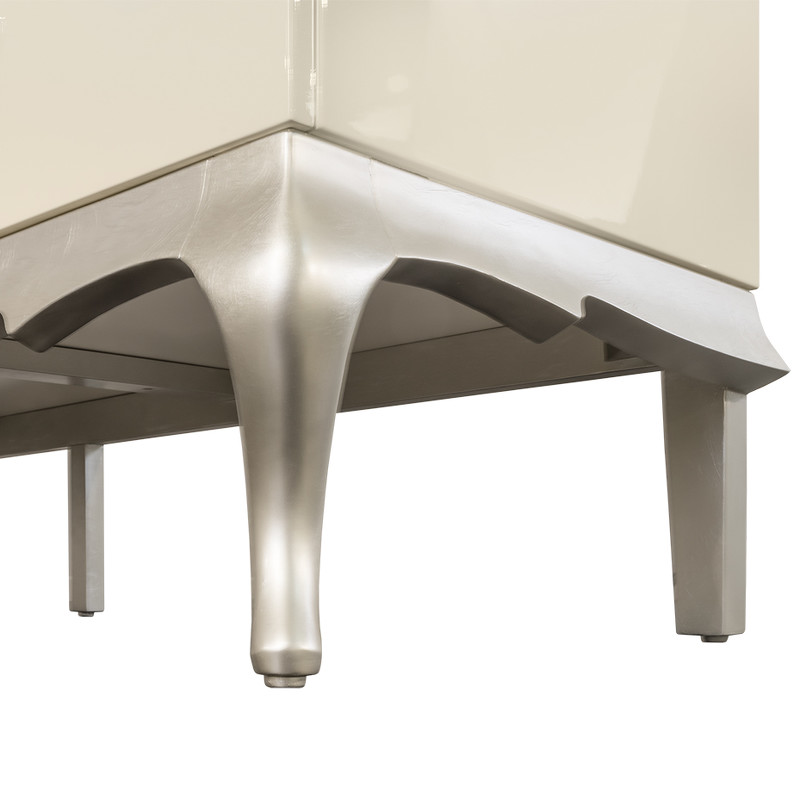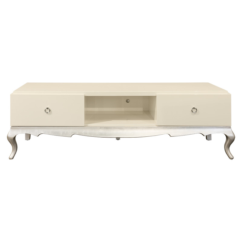ТВ тумба Venezia выполнена в стиле близком к классическому. Сочетание прямого корпуса и ножек кабриоль придает мебели этой коллекции особенную привлекательность. Прямые детали корпуса выполнены из МДФ класса Е1. Ножки и резная база - из массива дерева. Ручки круглые, цвет - хром. Отделка корпуса - перламутровый кремовый лак. Высокие гнутые ножки в отделке сусальное серебро, покрытое лаком шампань - ручное нанесение. 2 выдвижных ящика оснащены системой плавного закрывания. Без отверстия под провода. Передние ножки изогнутые, задние - прямые, что позволяет поставить ТВ тумбу плотно к стене.