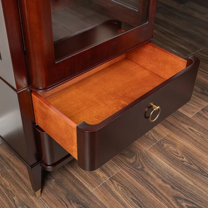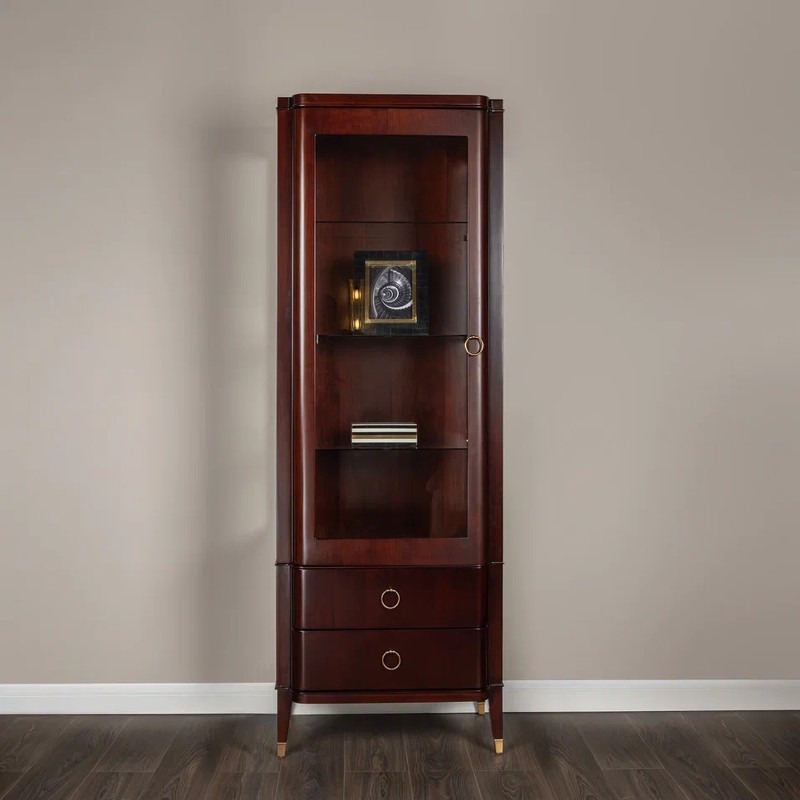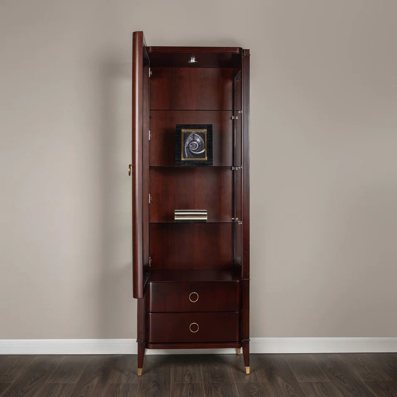Изящная витрина Modena от итальянского бренда Fratelli Barri. Витрина в неоклассическом стиле. Идеально сочетается строгость четких геометрических форм и шпон вишни в отделке. Прекрасный внешний вид дополнен многофункциональностью витрины – имеется два выдвижных ящика и стеклянные полочки. Дверка универсальная - можно установить с левым и правым открыванием. Для удобства использования есть встроенная подсветка. На ножках металлические колпачки. Выполнена из массива дерева и высококачественного МДФ класса Е1. Цвет фурнитуры - латунь. Ящики оснащены доводчиками для плавного закрывания. Стеклянная дверка и полки из закаленного стекла.