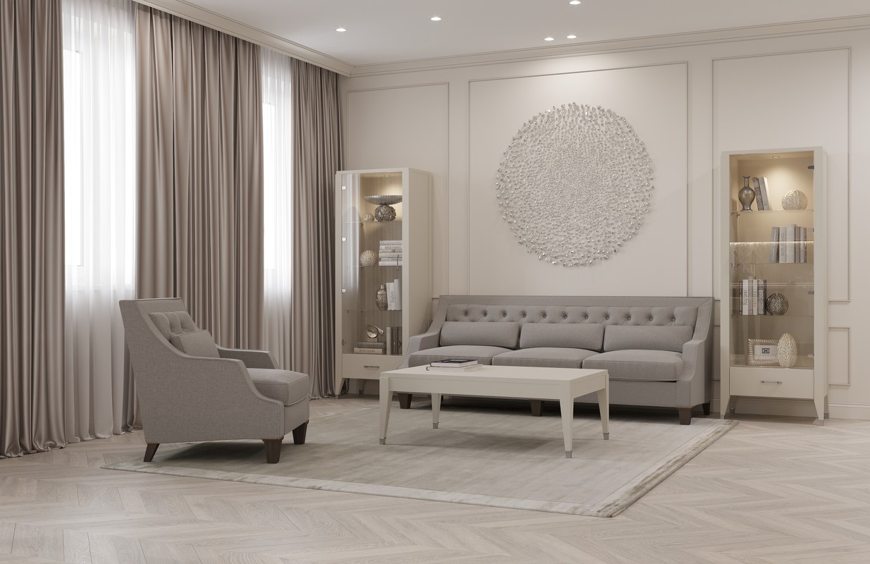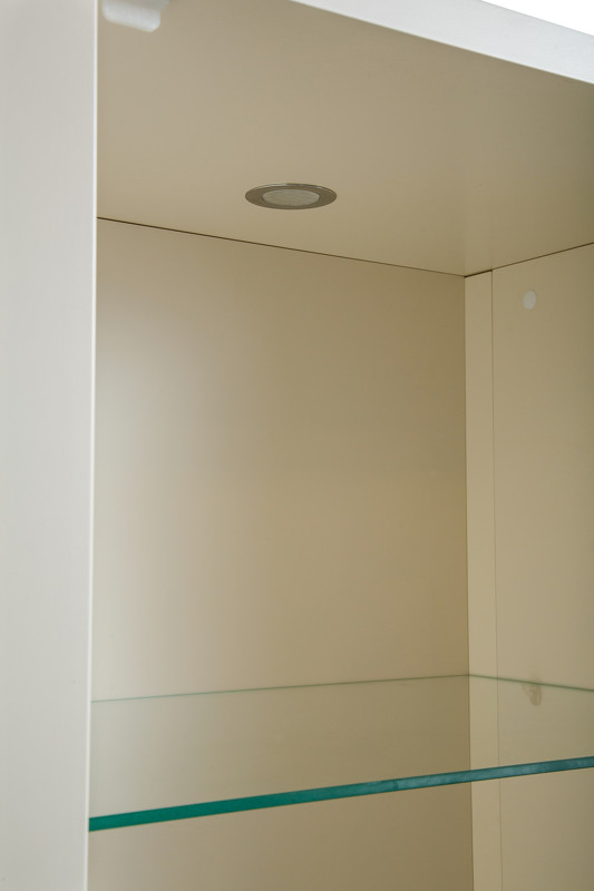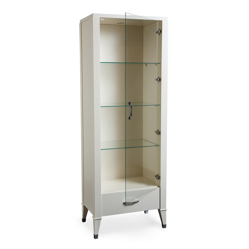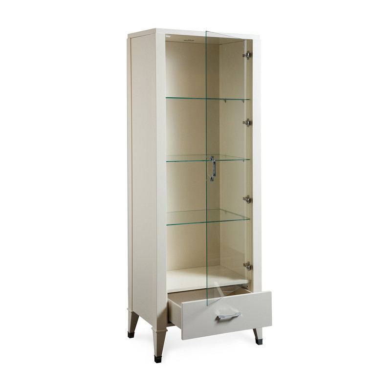 Витрина выполнена в современном стиле. Оснащена одной дверцей и ящиком. В производстве модели использовано закаленное стекло.
