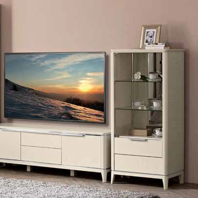 Витрина Salvador, оснащена одной стеклянной дверцей с двумя полками и подсветкой внутри, а также, двумя выдвижными ящиками. Мебель обновлённой коллекции «Salvador New» изготавливается из шпонированного ДСП ясень, натурального дерева ясень и лДСП. Отделка мебели выполнена полиуретановыми ЛК материалами.