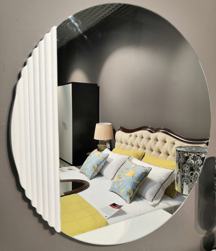 Лаконичное круглое зеркало с диаметром 90 см. Рама покрыта лаком, торцы и задняя стенка — блестящий белый блестящий лак. Глубина — 3,6 см, вес небольшой — 8 кг. Данный предмет является частью коллекции Rimini от Fratelli Barri. В том же дизайне у нас вы найдете весь комплект мебели для гостиной, столовой и спальни.