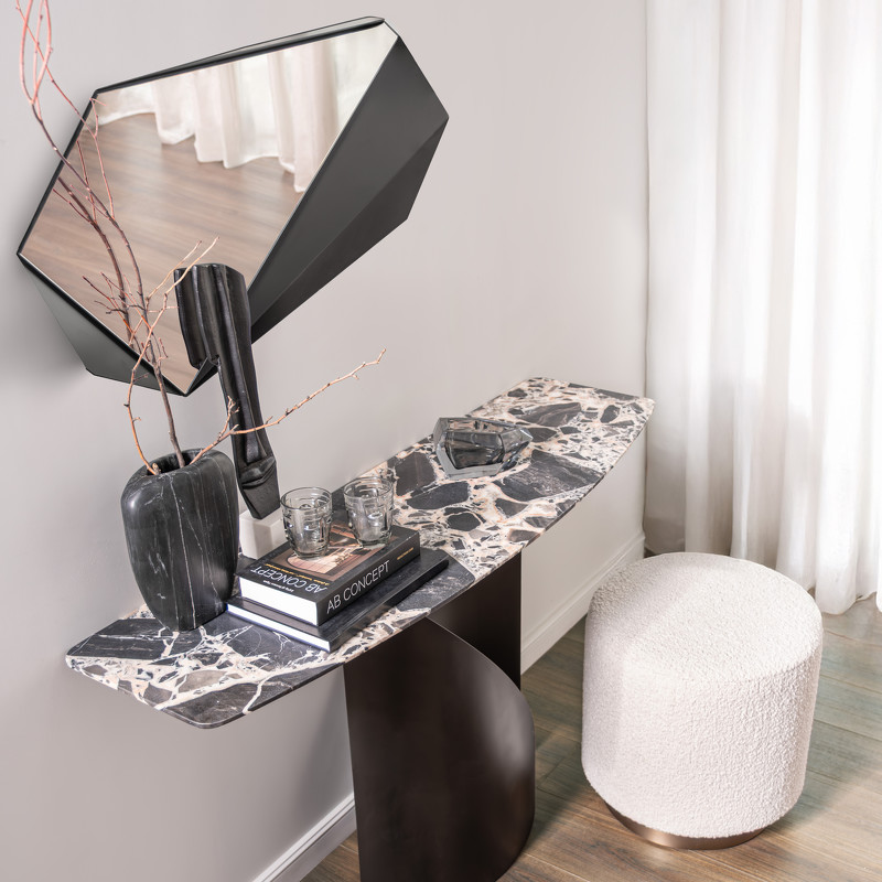 Дизайнерское зеркало от бренда Fratelli Barri. За счет зеркал в помещении, можно значительно визуально расширить небольшое пространство. Благодаря своей необычной форме, зеркало будет притягивать взгляды и станет акцентом интерьера. Акцентная необычная рама выполнена из металла в лаке черного цвета с легким глянцем