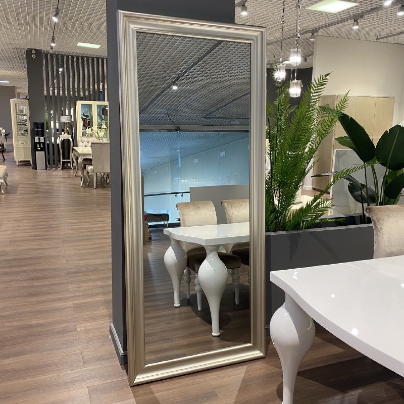 Зеркало выполнено в стиле ар-деко. Багетная рама из высококачественного МДФ высокой плотности в отделке серебряное напыление. Не крепится к стене.Очень интересное и модное дизайнерское решение современности - оформление интерьера с помощью напольных зеркал. Это позволяет более функционально использовать пространство помещения, зрительно расширяя его.