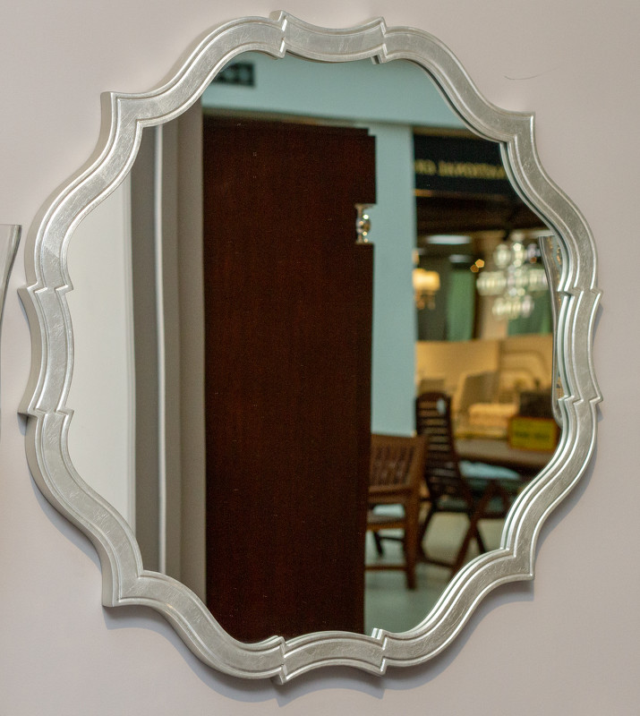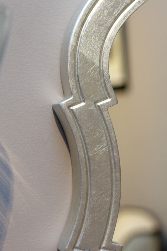Зеркало выполнено в стиле ар-деко. Рама в отделке сусальное серебро, покрытое лаком шампань.
