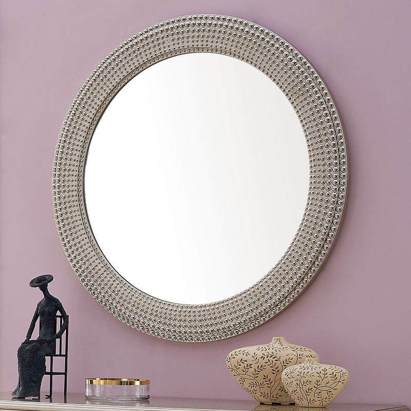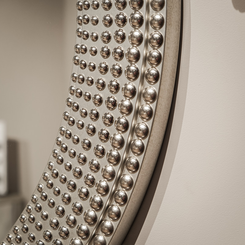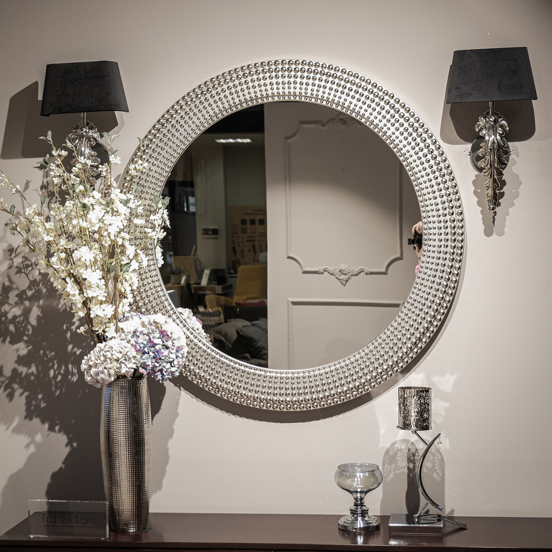 Круглое зеркало от итальянского бренда Fratelli Barri с эффектной рамой - имитацией бусинок разного диаметра. Изготовлено из высококачественного МДФ. Отделка - лак, цвет - патинированное серебро. Зеркало может составить комплект к буфету или комоду или быть самостоятельным украшением интерьера.