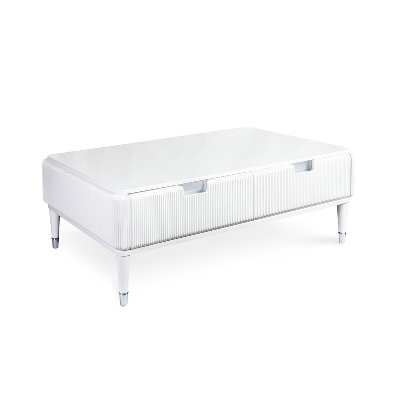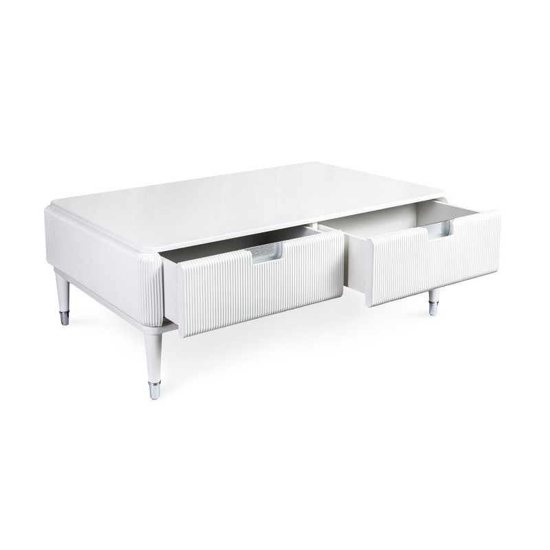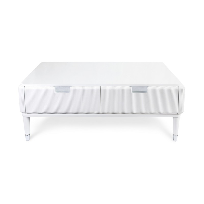 Журнальный стол от итальянского бренда Fratelli Barri. Закругленная форма и рифленые фасады выглядят очень актуально. Ножки прямые круглые, зауженные к низу. На ножках металлические колпачки. У стола 4 ящика - по 2 с каждой длинной стороны. Ручка - выемка на фасаде. Вставка за ручкой - металлическая пластина. Отделка - белый глянцевый лак. Выполнен из массива дерева и высококачественного МДФ класса Е1. Цвет фурнитуры - хром. Ящики оснащены доводчиками для плавного закрывания. Данный предмет является частью коллекции Rimini. Вы можете оформить гостиную, столовую, спальню, кабинет и другие комнаты Вашего дома в едином стиле.