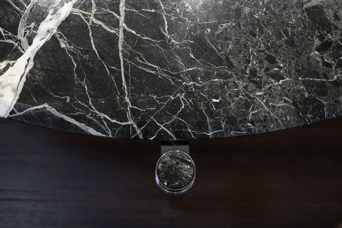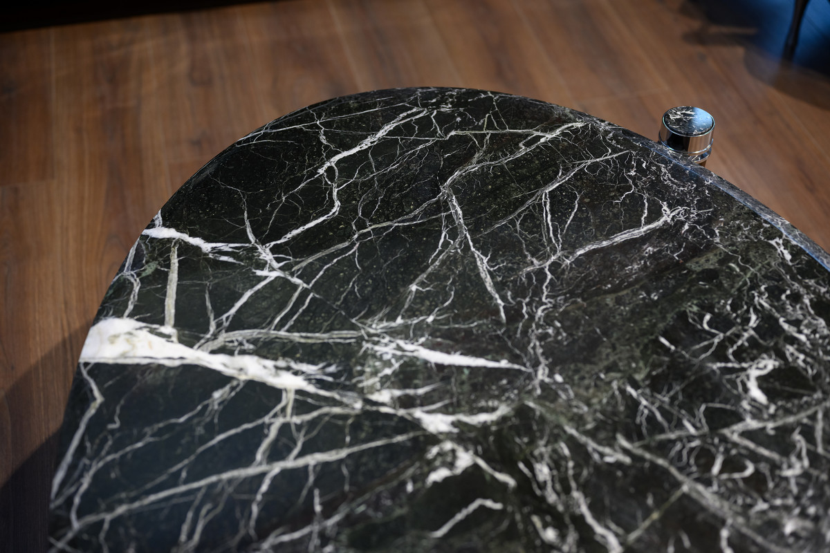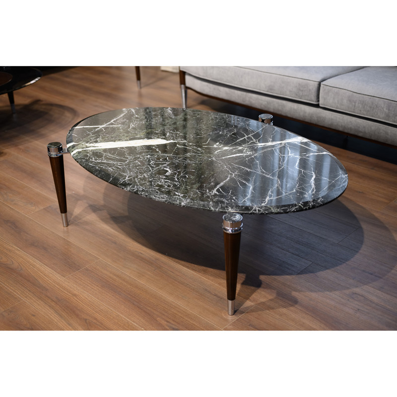 Журнальный столик выполнен в стиле Ар-деко. Столешница изготовлена из мрамора, ножки массив бука, детали металл.