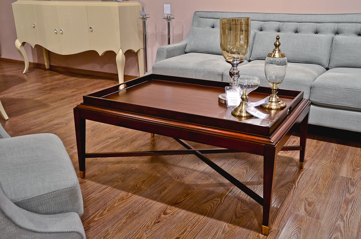 Журнальный стол в стиле неоклассика от итальянского бренда Fratelli Barri. Столешница дополнена подносом с ручками. Ножки имеют декоративные металлические колпачки. Каркас — массив дерева и высококачественная МДФ высокой плотности, отделка — натуральный шпон махагона. Внимание! Нижняя крестовина не рассчитана на нагрузку — поднос переставлять вниз не рекомендуется. Модель принадлежит к коллекции мебели Mestre в стиле неоклассика от Fratelli Barri. Здесь вы можете найти мебель для гостиной, столовой и спальни: сотни вариантов доступны для комбинации друг с другом.