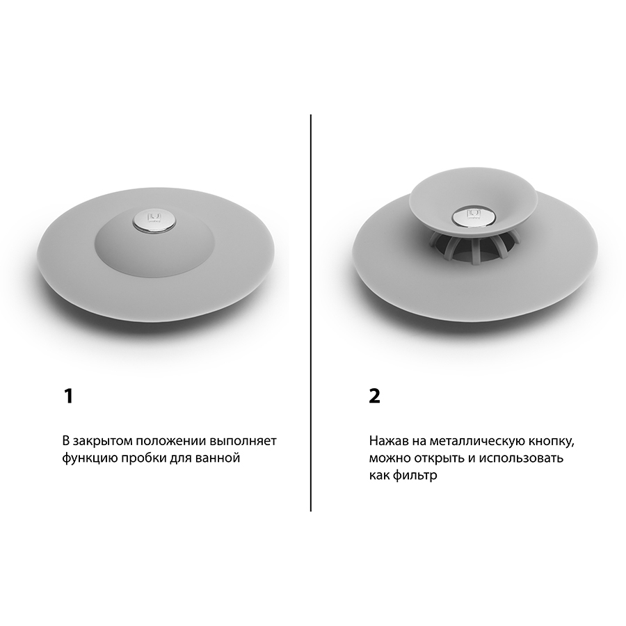 Фильтр поможет поддерживать исправную работу слива. Нажмите на металлическую кнопку в центре, чтобы вода сливалась через фильтр, задерживая в нем мусор. Нажмите на силиконовые крылышки вокруг кнопки, и фильтр закроет слив, чтобы вы смогли наполнить ванну. Сочетается с другими аксессуарами из коллекции Flex. Материал: силикон, нержавеющая сталь. Размеры: 10х10х3 см. Цвет: серый. Можно мыть в теплой мыльной воде при помощи мягкой губки.