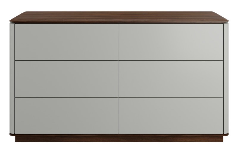 Стильный габаритный комод с шестью ящиками из коллекции Altea от бренда MOD Interiors. Комод выполнен из высококачественного МДФ высокой прочности. Отделка корпуса и фасадов — матовый лак светло-серого оттенка. Отделка столешницы и базы — натуральный шпон ореха. Ящики с системой push-to-open (открывание нажатием без ручек). Фасады гладкие, без узора.