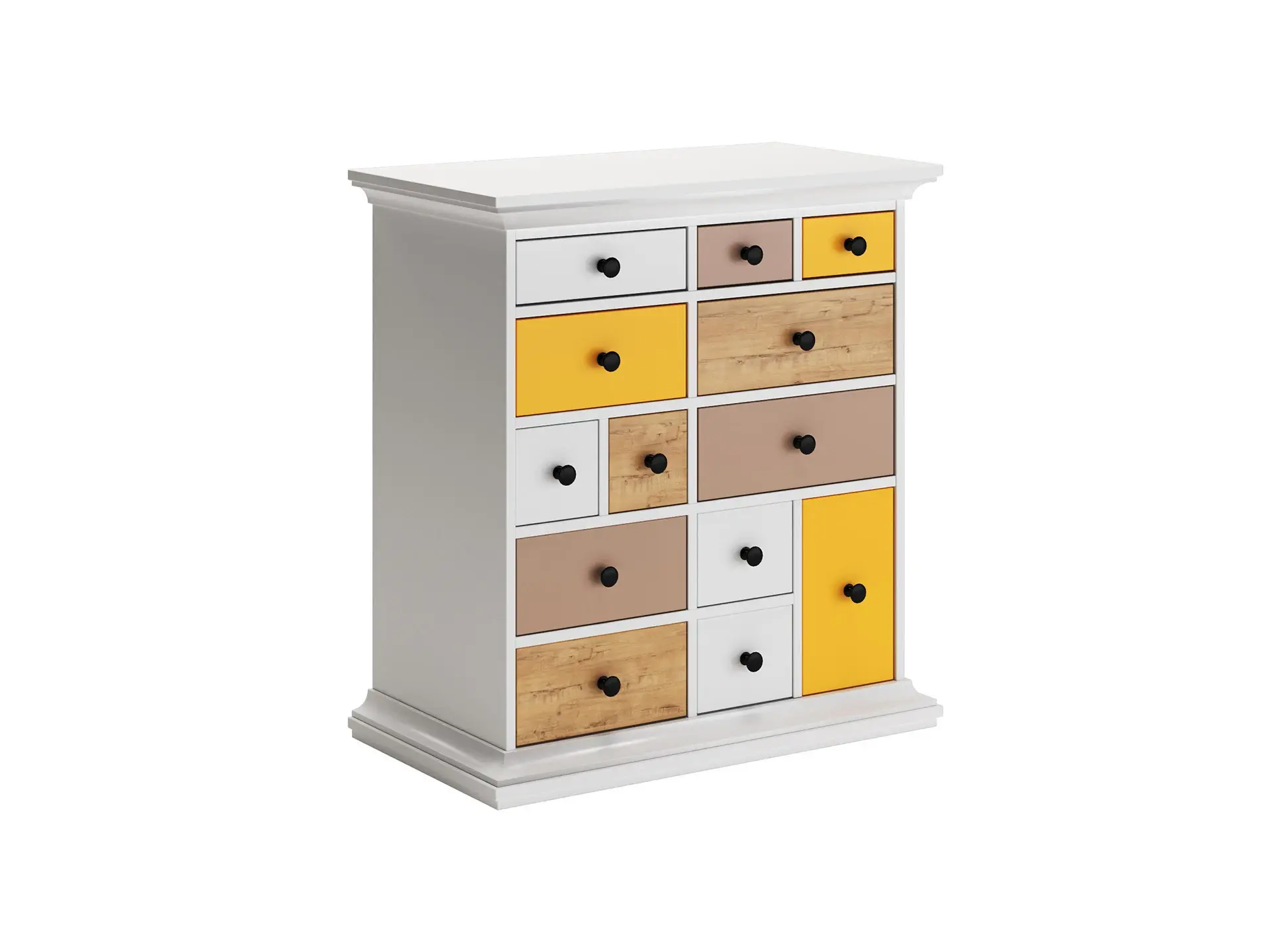 Комод имеет 13 выдвижных ящиков разных размеров, расположенных в пяти горизонтальных рядах. Движение ящиков происходит скольжением без направляющих, по фанерным брускам, установленных на дно отделений. Стенки ящиков выполнены из ЛДСтП 10 мм в цвет корпуса. Ручки черного цвета
