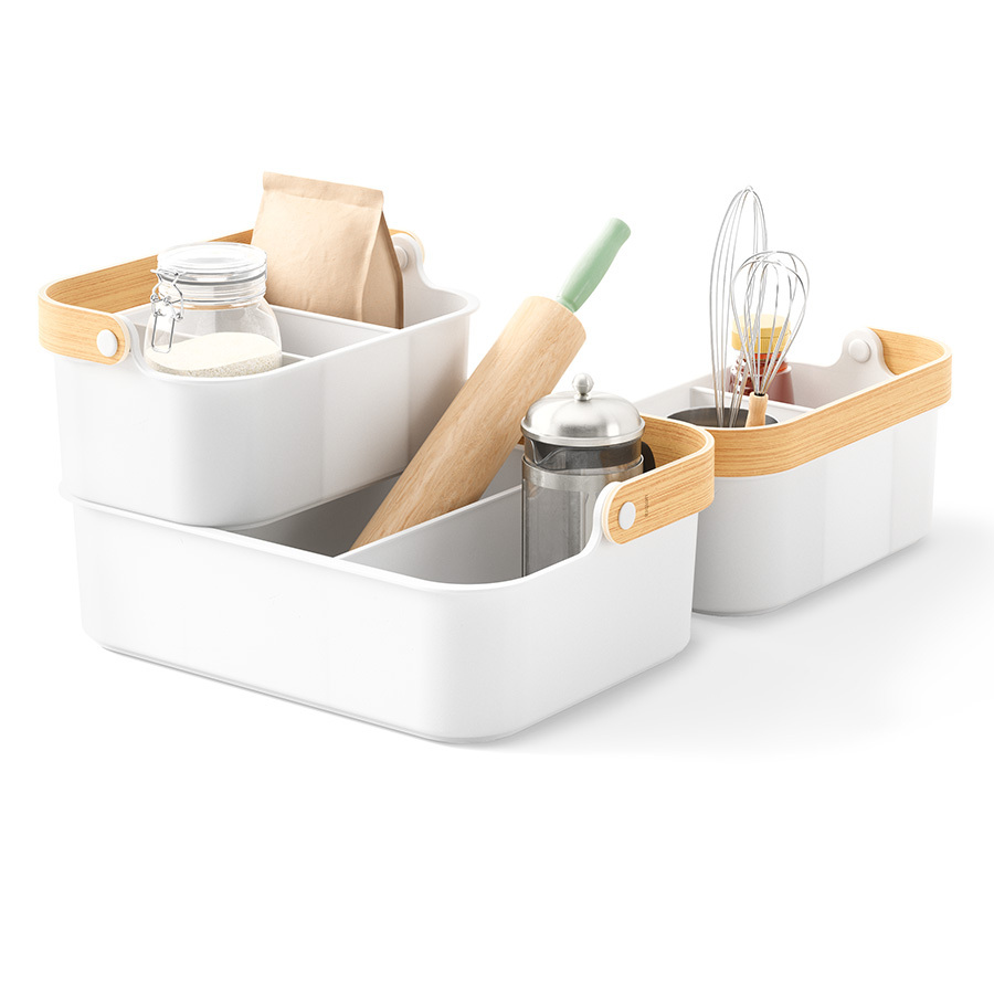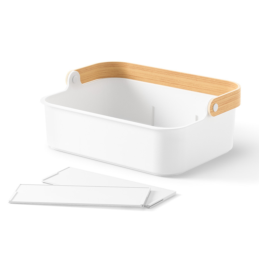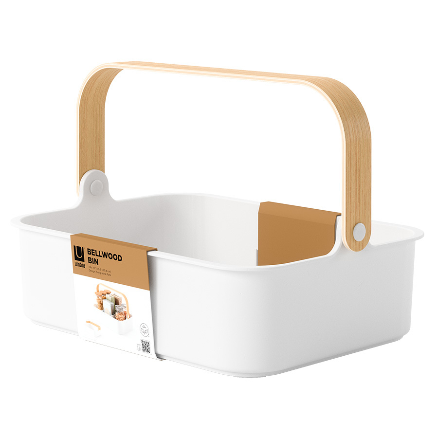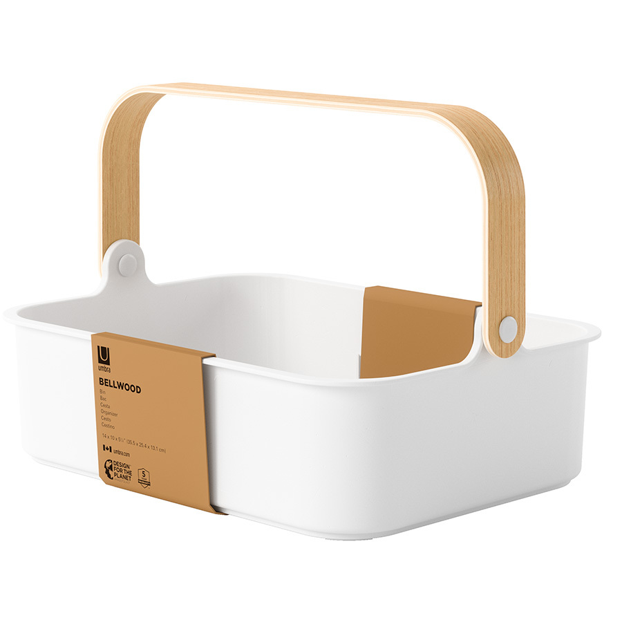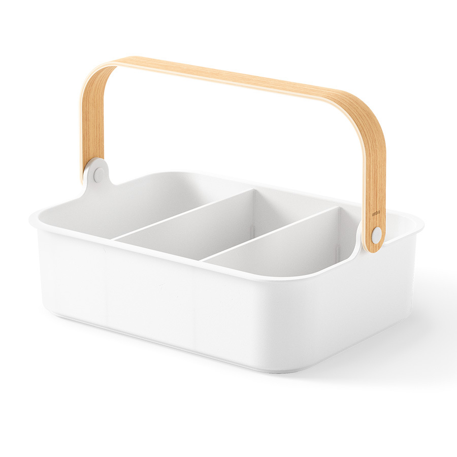Органайзер Bellwood поможет организовать компактное хранение продуктов и вещей в любой из комнат. Специальные разделители позволяют удобно размещать и сортировать предметы. Органайзер на 80% выполнен из переработанного АБС-пластика, известного своей прочностью, устойчивостью к износу и долговечностью. Он оснащен ручкой из древесины, которая обеспечивает простую переноску, а также делает дизайн привлекательным и интересным. Материалы: переработанный АБС-пластик, тополь, ясень, нейлон, силикон. Размеры: 37х27х25 см. Цвет: белый/натуральное дерево. Пыль и загрязнения с поверхностей можно удалять при помощи мягкого влажного материала. Запрещается использование абразивов и агрессивной бытовой химии.