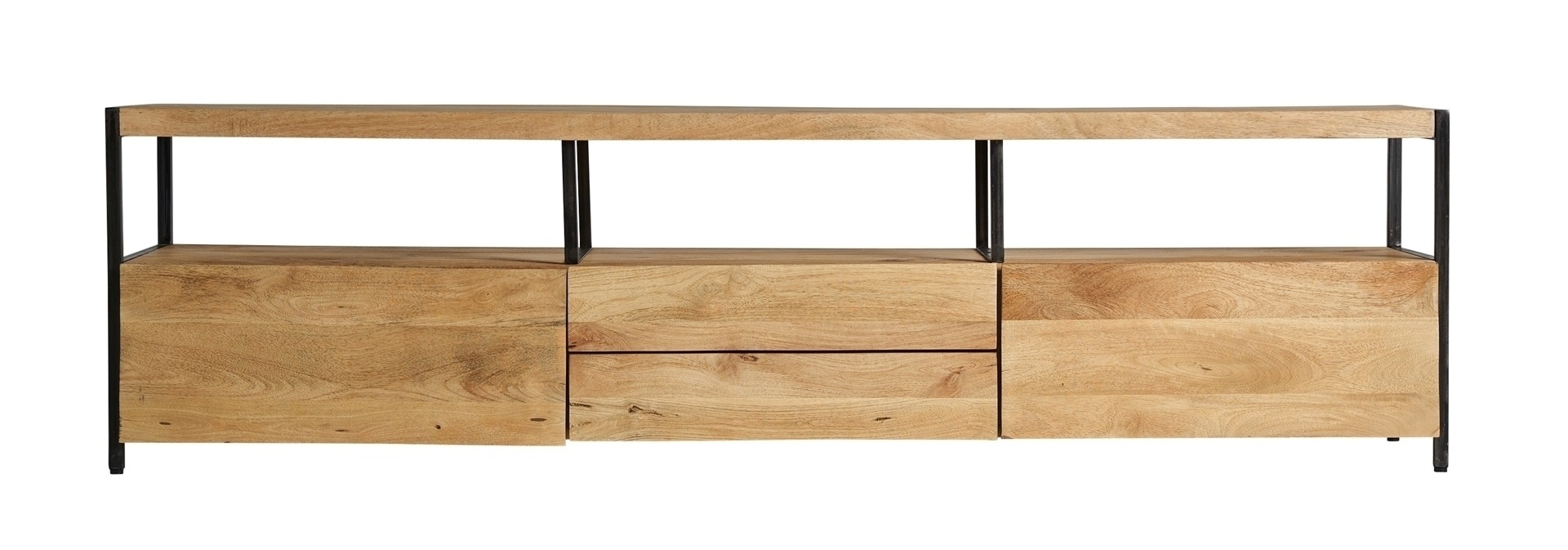 Подставка для телевизора Celle, черный/натуральный цвет, колониальный стиль. Изготовлен из дерева манго в сочетании с железом. Ширина 190 см позволяет создать гармоничную медиа-зону в гостиной среднего размера, а сочетание теплого натурального дерева с черным металлом придает интерьеру характер и колониальный шарм.