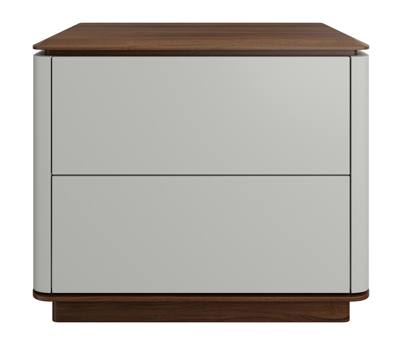 Прикроватная тумбочка с двумя ящиками из коллекции Altea от бренда MOD Interiors. Контрастность отделки придает модели яркости и свежести. Закругленные углы смягчают резкость прямых форм и делают мебель безопасной и комфортной. Тумбочка выполнена из высококачественного МДФ высокой прочности. Отделка корпуса и фасадов — матовый лак светло-серого оттенка. Отделка столешницы и базы — натуральный шпон ореха. Два ящика с системой push-to-open (открывание нажатием без ручек). Фасады гладкие, без узора.