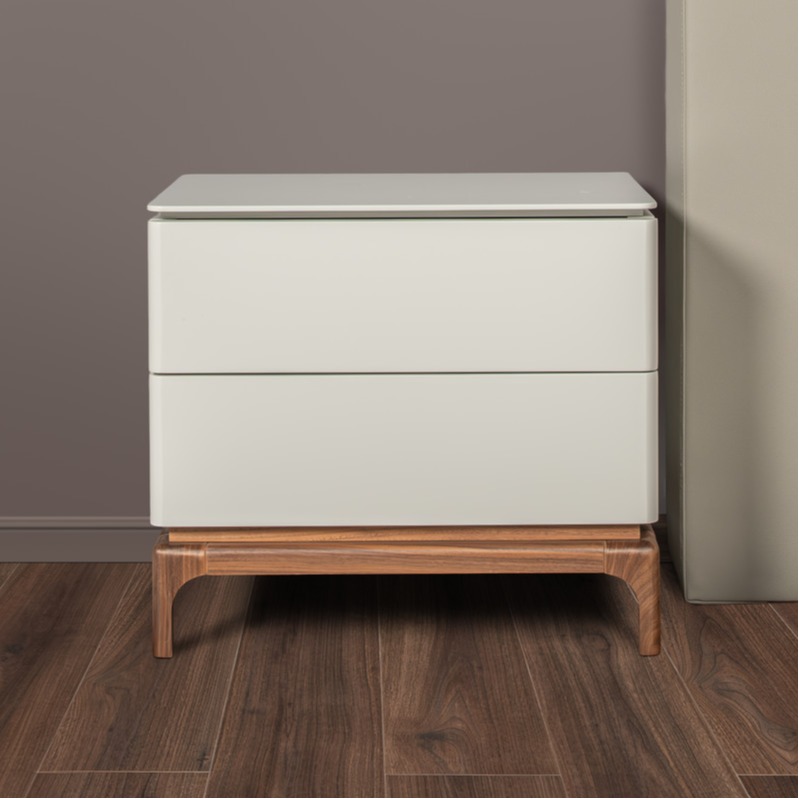 Прикроватная тумбочка от бренда MOD Interiors в современном стиле. Корпус и столешница из МДФ в отделке матовым светло-серым лаком. База из массива дерева в шпоне ореха. У тумбочки 2 ящика с системой push-to-open.