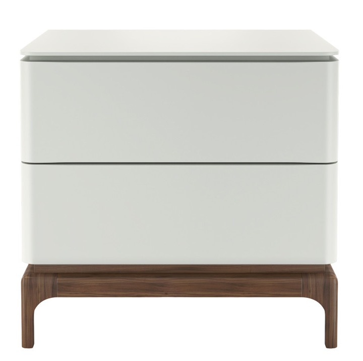 Компактная прикроватная тумбочка с двумя выдвижными ящиками. Корпус и столешница из МДФ высокой прочности в отделке матовый лак светло-серого оттенка. База из массива дерева в натуральном шпоне ореха. Два ящика со скрытыми направляющими и системой push to open (открывание нажатием).