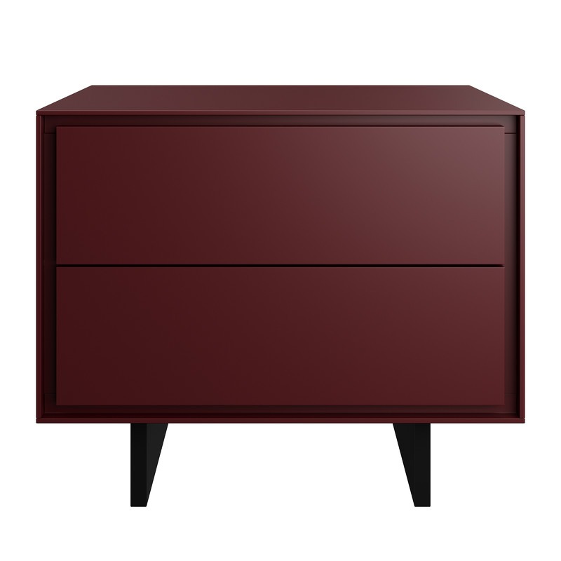 Акцентная прикроватная тумбочка Miramar в современном стиле на высоких ножках. Выполнена из высококачественного сертифицированного МДФ высокой плотности. Отделка — матовый лак роскошного винного оттенка. Ножки из металла, окрашены в черный матовый цвет. Высота ножек 12 см. Два выдвижных ящика со скрытыми направляющими и системой открывания push to open (открывание нажатием).