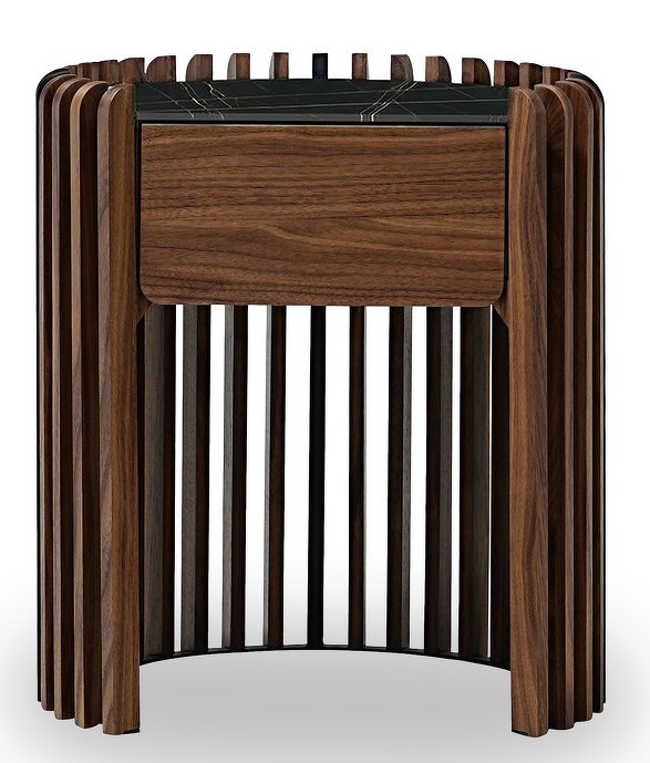 Прикроватная тумбочка из коллекции Tishina (дизайн Сергея Трегубова). Контраст текстур: шпон американского ореха и чёрная керамическая столешница. Внутри ящика бирюзовое окрашивание, дно из экокожи в тон. Механизм push-to-open. Встроенная LED подсветка с сенсорным включением (touch switch) на столешнице.