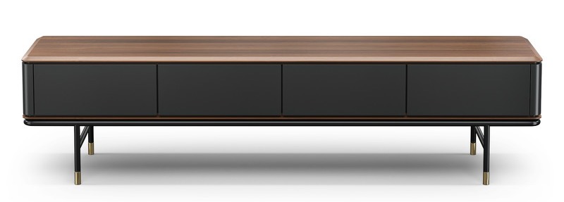Тумба под TV с четырьмя ящиками из коллекции Altea от бренда MOD Interiors. Стиль mid-century modern с влиянием ретро 60-х. Высокие черные ножки с латунными колпачками. Матовые грифельно-серые фасады. Столешница из шпона ореха со скругленными углами. Четыре ящика с системой push-to-open.