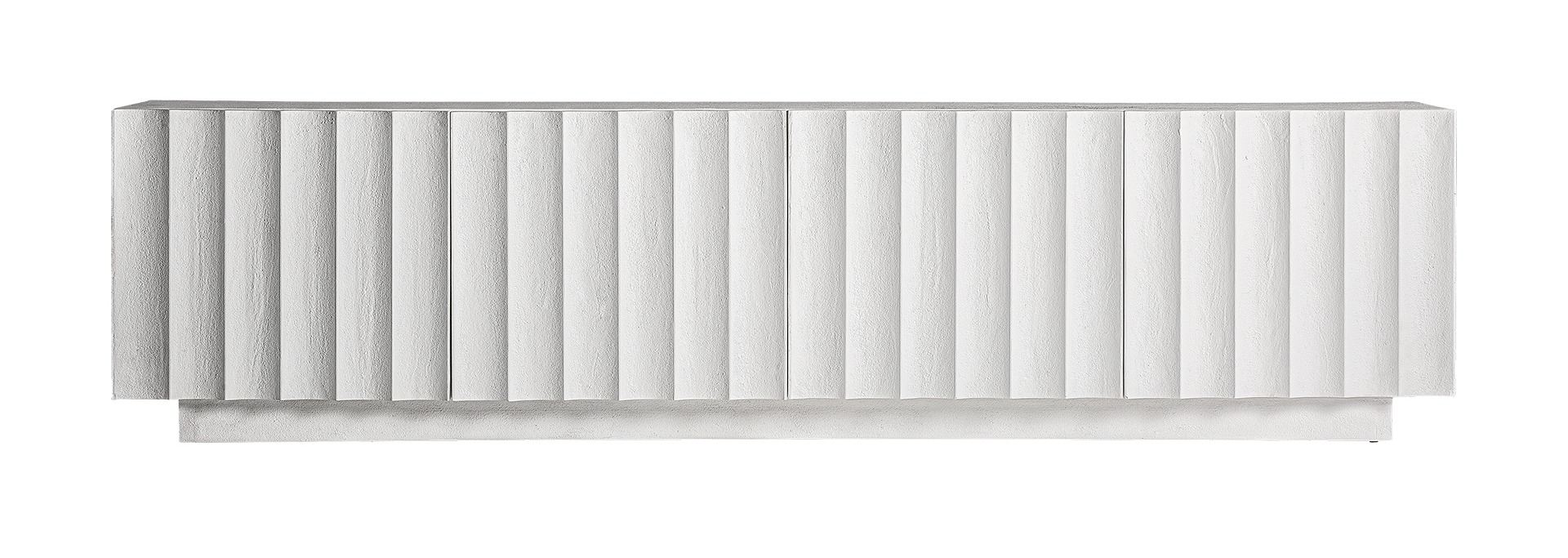Тумба под ТВ Mulcey, в белом современном стиле. Изготовлен из цемента. Ширина 200 см позволяет создать выразительную медиа-зону, которая станет архитектурным центром гостиной, а белый цвет придает интерьеру чистоту, свет и визуальную легкость.