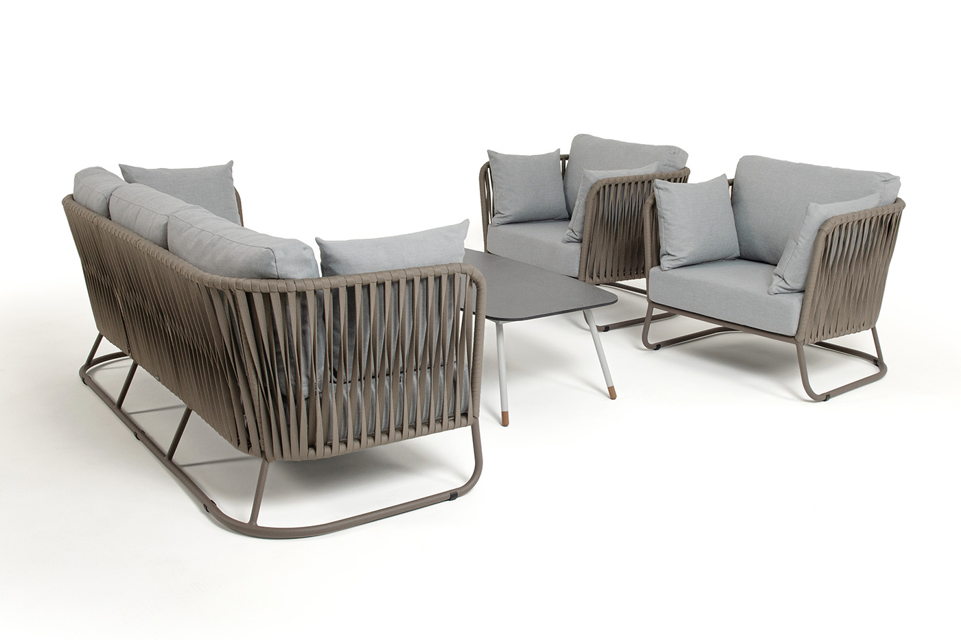 Комплект создан с использованием высококачественных материалов. Каркас дивана и кресел — из прочного алюминия с порошковым покрытием, устойчивым к коррозии. Оплетка выполнена вручную из эластичных полиэфирных лент (роупа). Мягкие подушки обтянуты тканью. Журнальный столик имеет алюминиевый каркас и столешницу из износостойкого HPL.