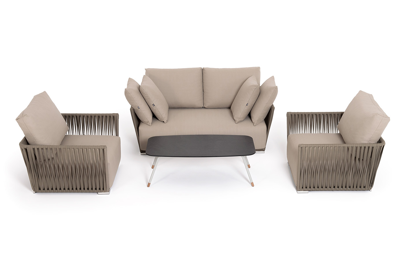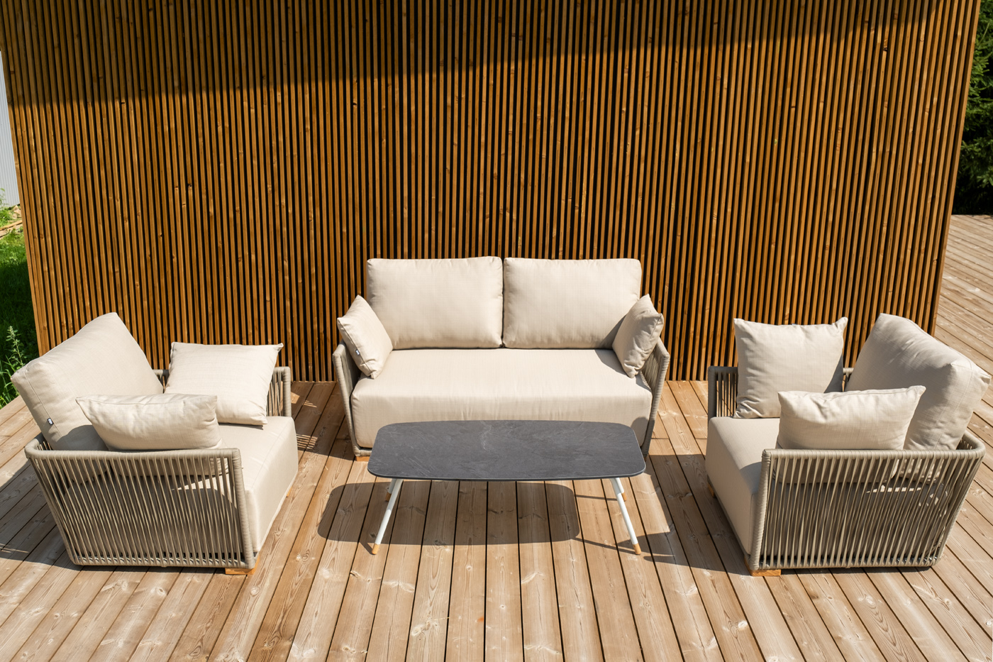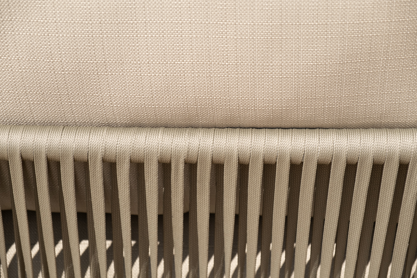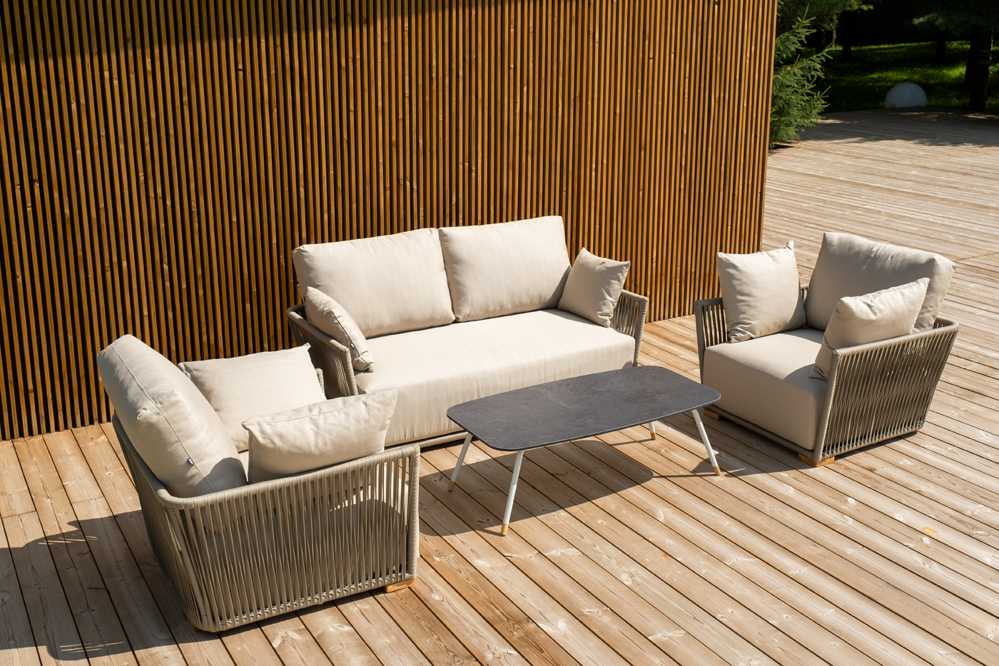 Каркас дивана и кресел выполнен из прочного алюминия с порошковым покрытием светло-серого цвета (RAL7035) муар. Он оплетен вручную серо-коричневым роупом толщиной 23 мм. Подушки из ткани Mossle бежевого цвета. Столик «Верона» имеет алюминиевый каркас и столешницу из HPL «серый гранит».