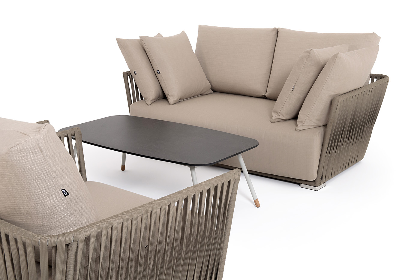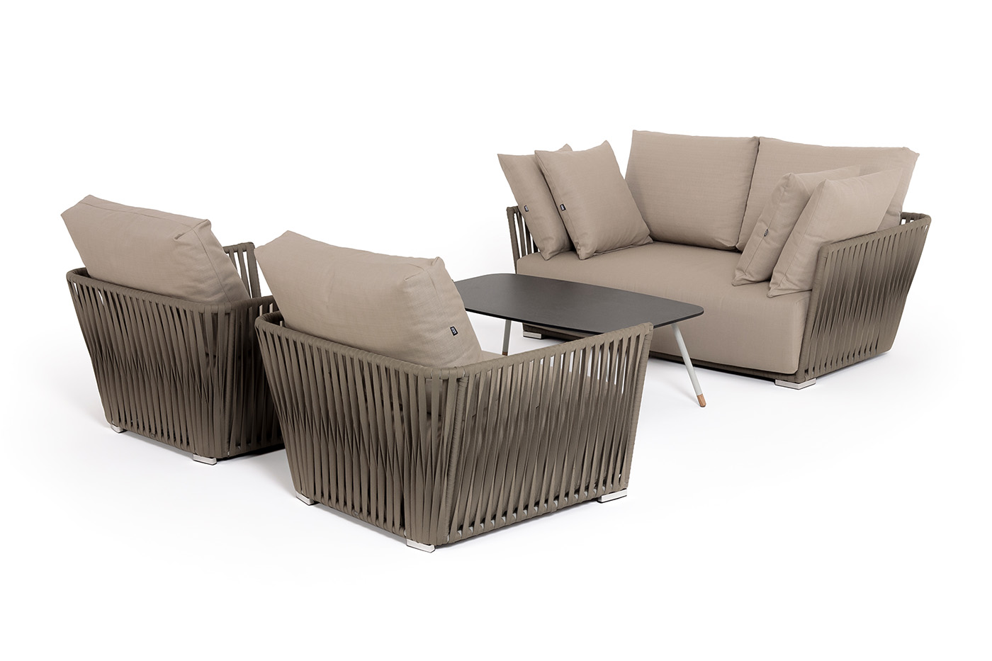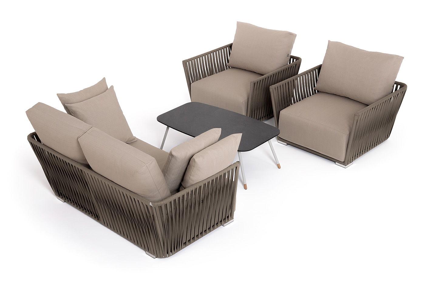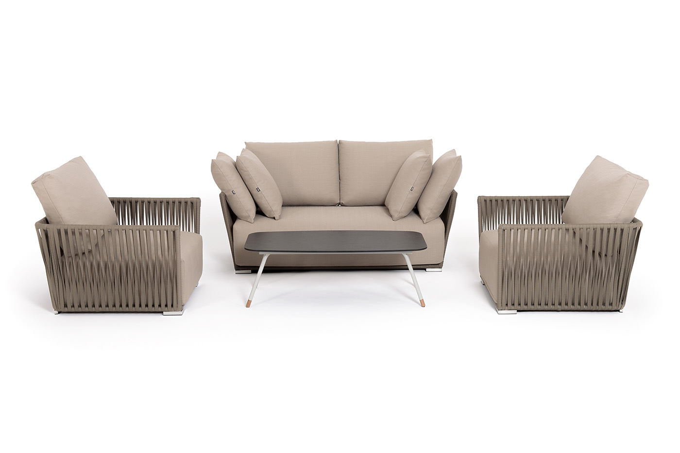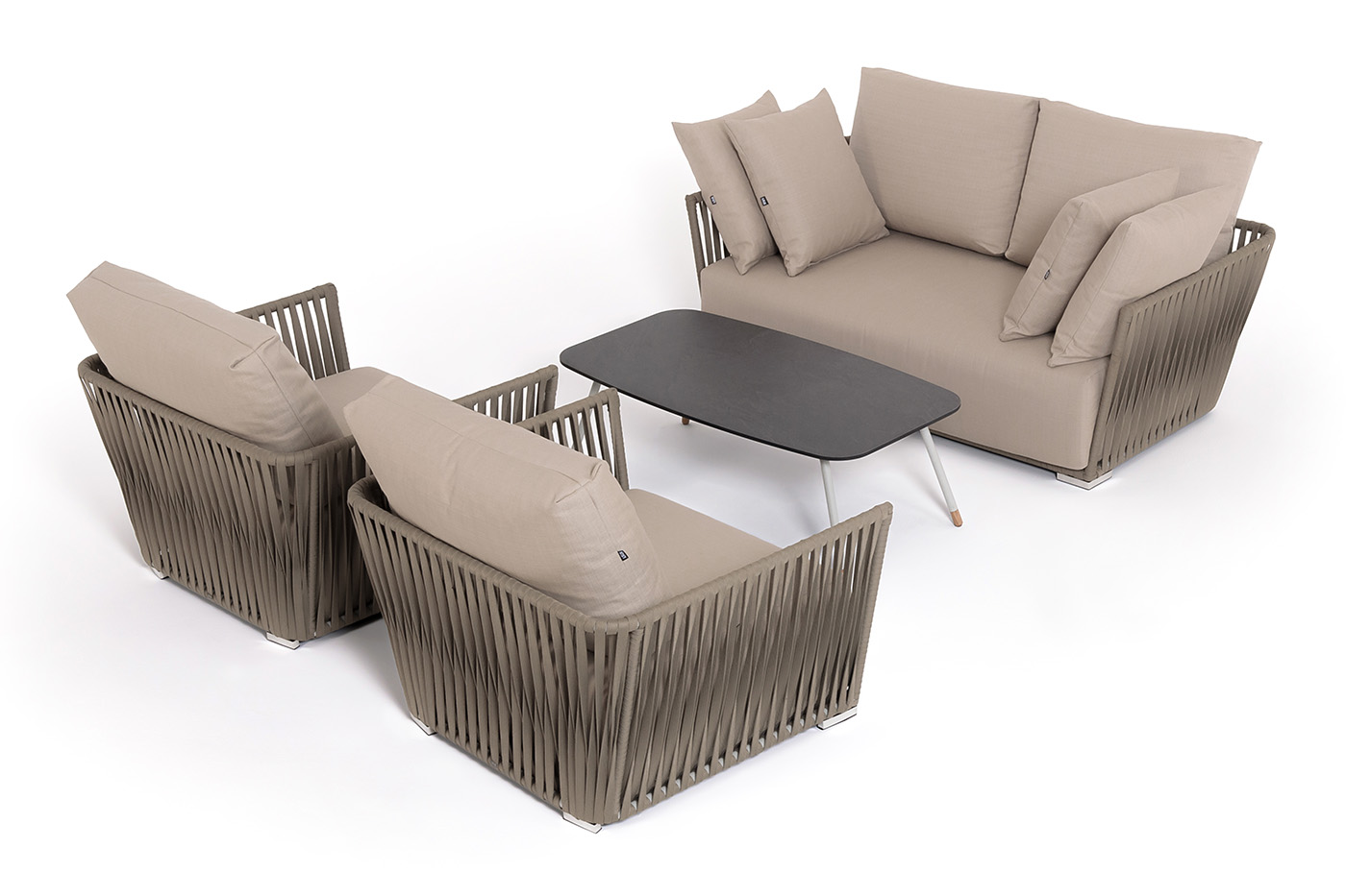Каркас дивана и кресел выполнен из прочного алюминия с порошковым покрытием светло-серого цвета (RAL7035) муар. Он оплетен вручную серо-коричневым роупом толщиной 23 мм. Подушки из ткани Mossle бежевого цвета. Столик «Верона» имеет алюминиевый каркас и столешницу из HPL «серый гранит».