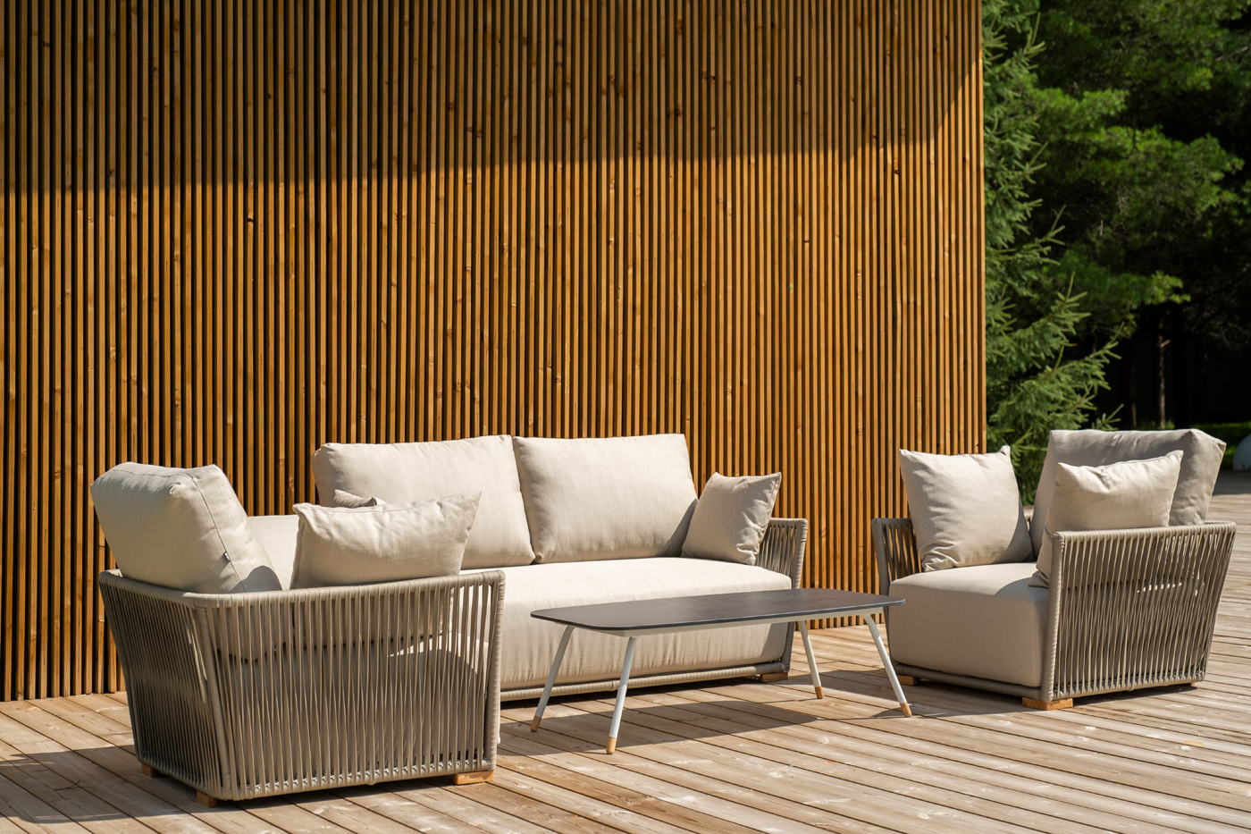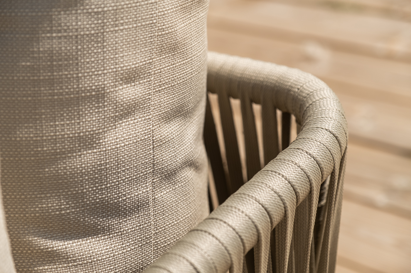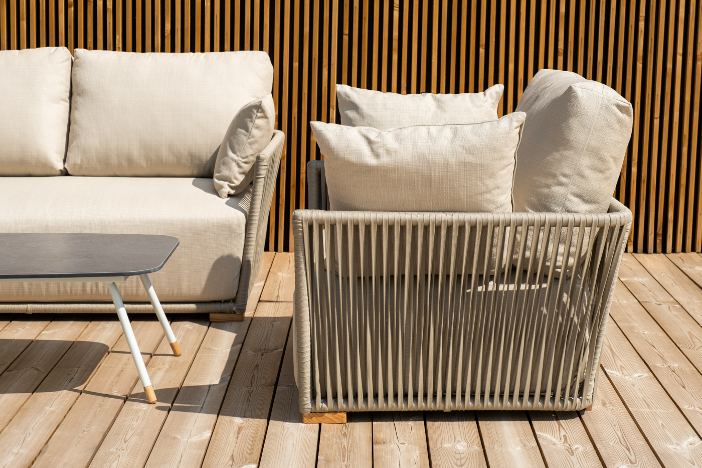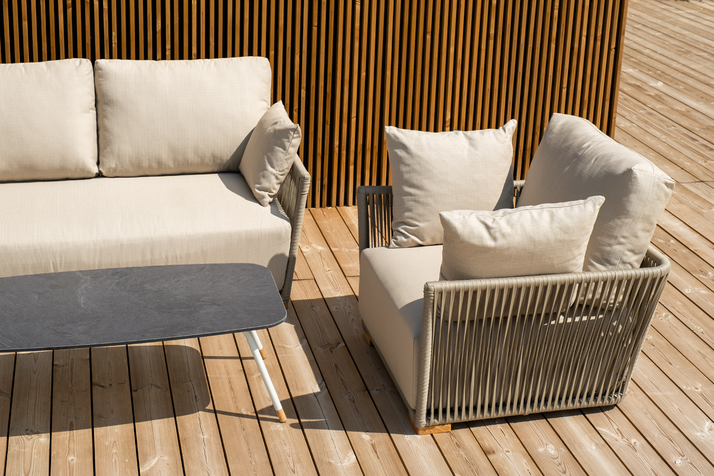 Каркас дивана и кресел выполнен из прочного алюминия с порошковым покрытием светло-серого цвета (RAL7035) муар. Он оплетен вручную серо-коричневым роупом толщиной 23 мм. Подушки из ткани Mossle бежевого цвета. Столик «Верона» имеет алюминиевый каркас и столешницу из HPL «серый гранит».