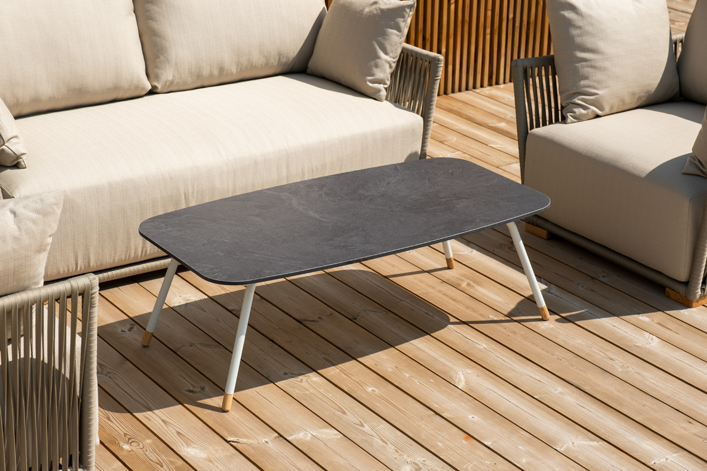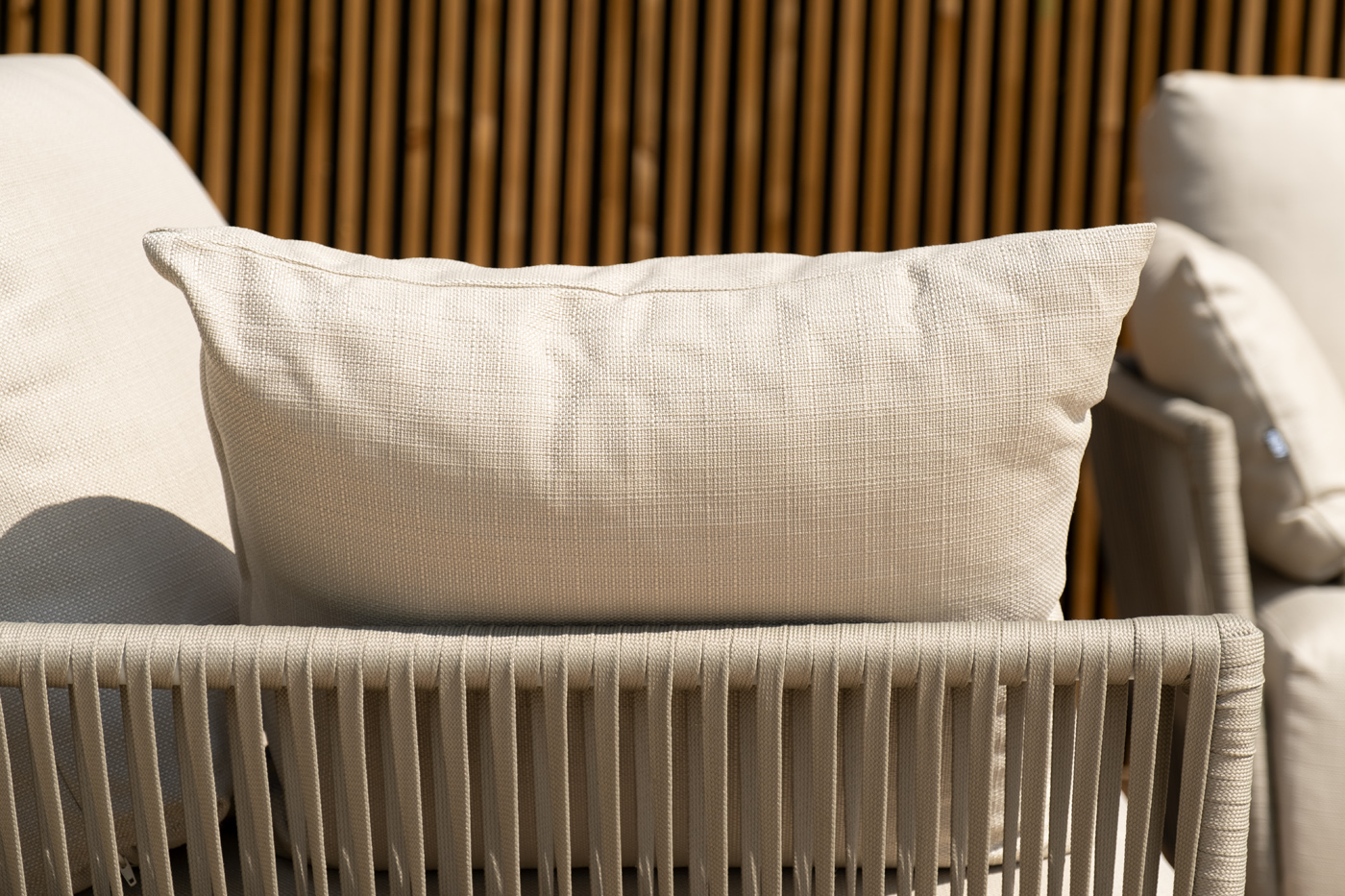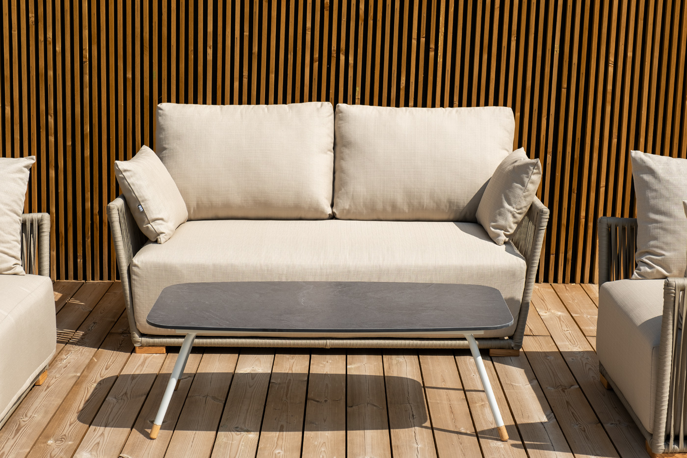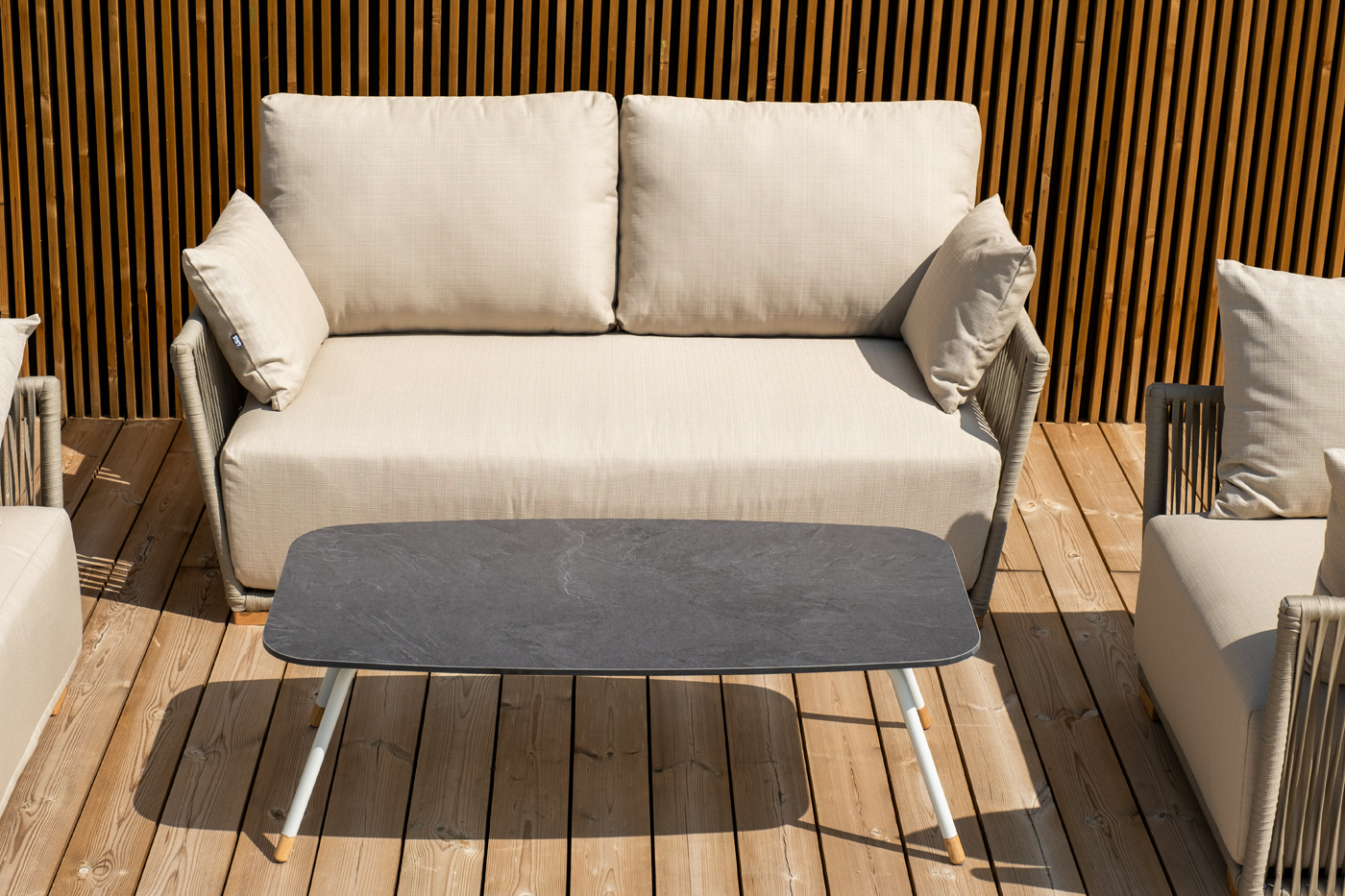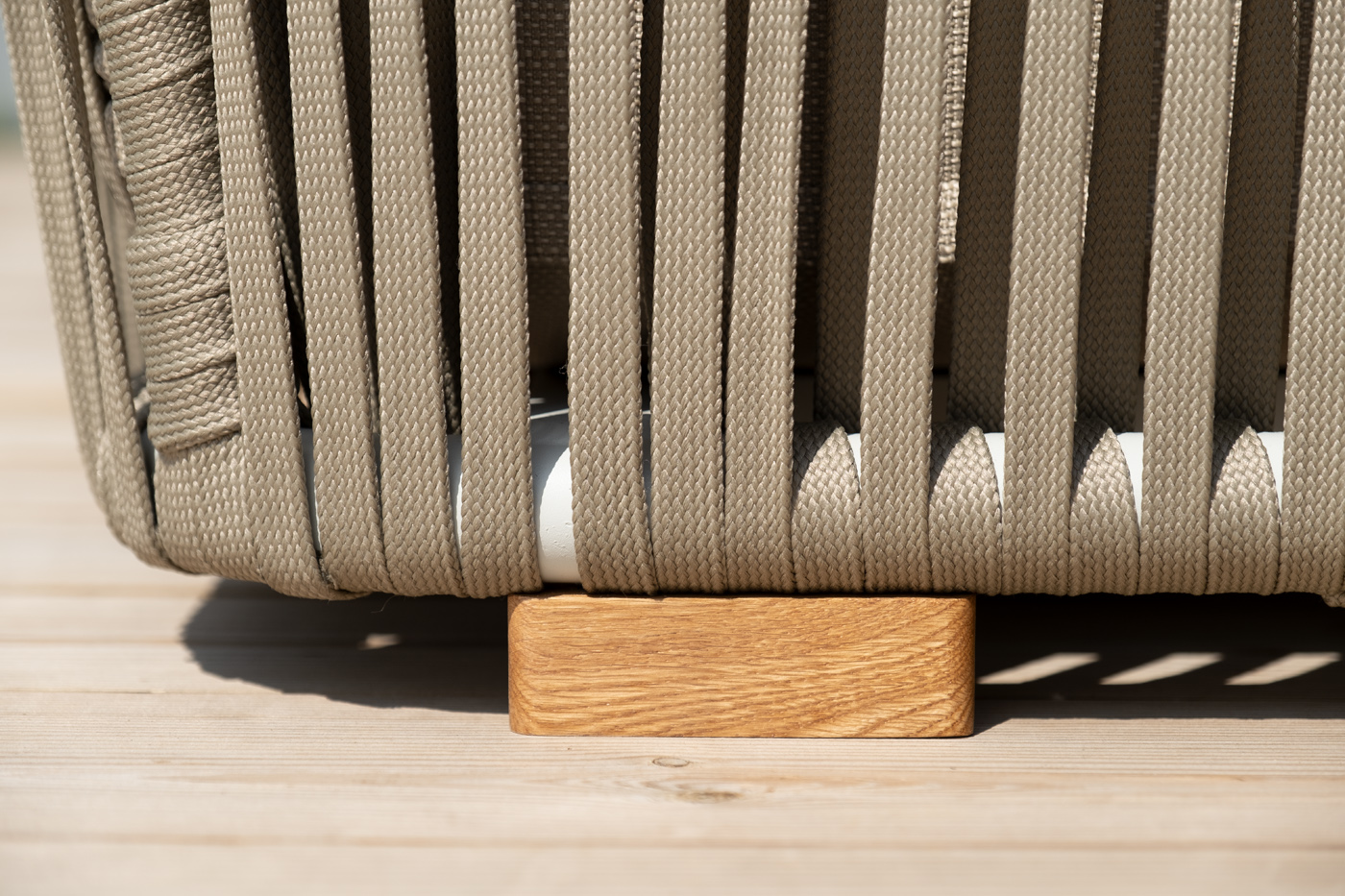Каркас дивана и кресел выполнен из прочного алюминия с порошковым покрытием светло-серого цвета (RAL7035) муар. Он оплетен вручную серо-коричневым роупом толщиной 23 мм. Подушки из ткани Mossle бежевого цвета. Столик «Верона» имеет алюминиевый каркас и столешницу из HPL «серый гранит».