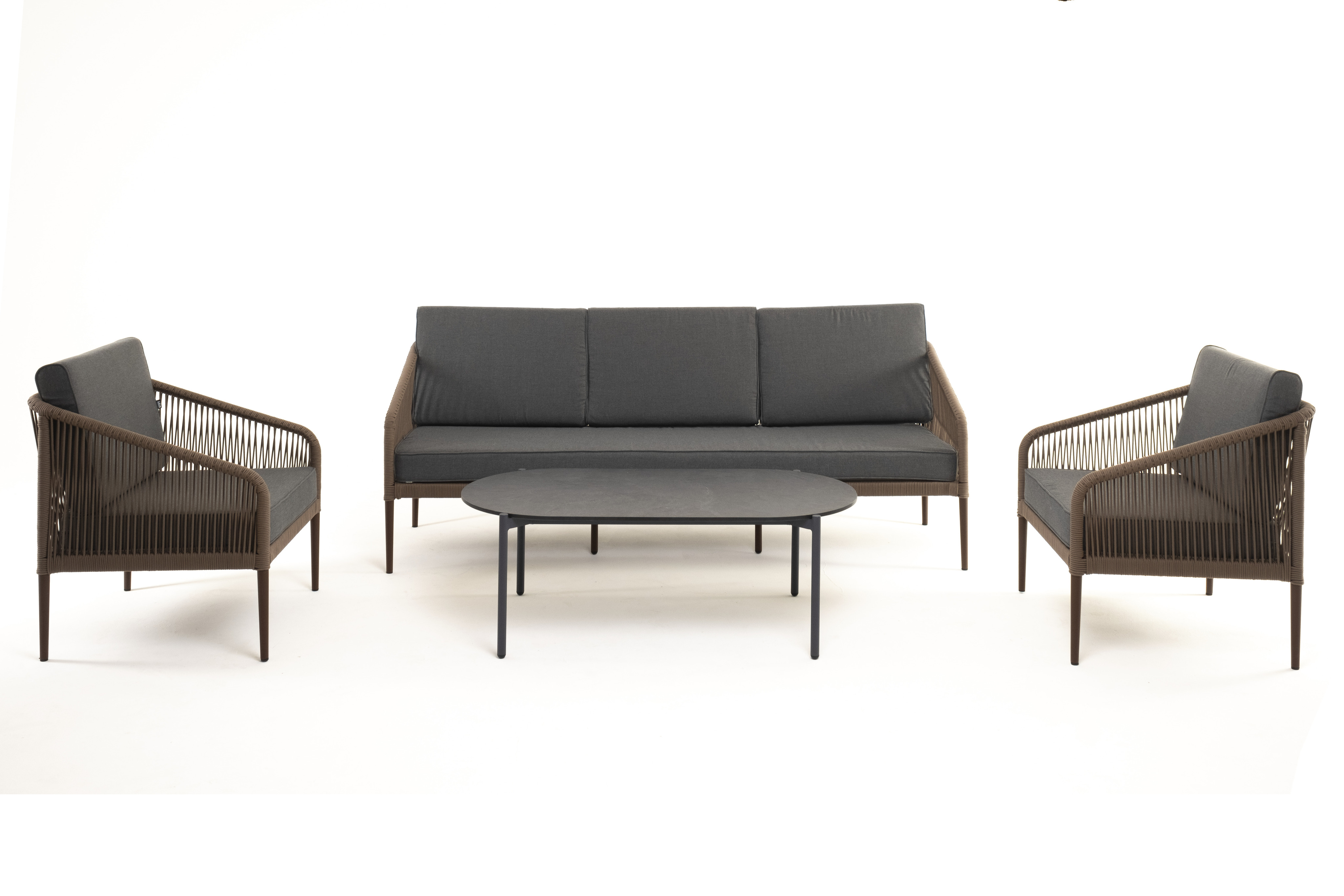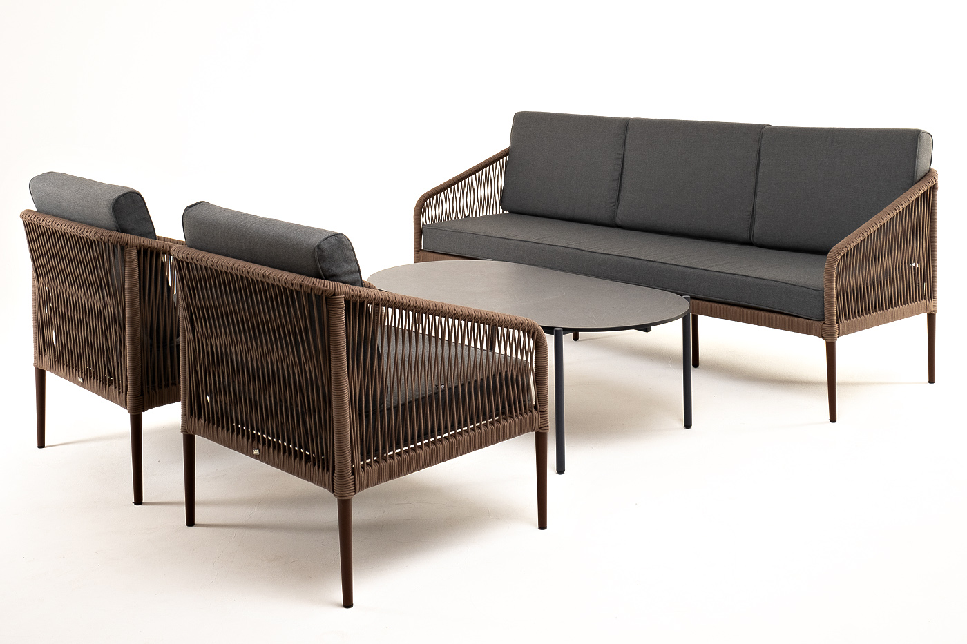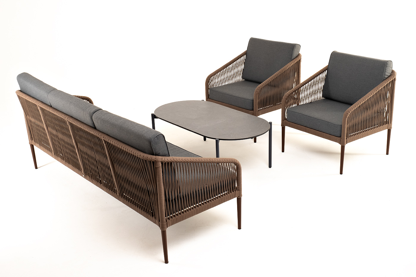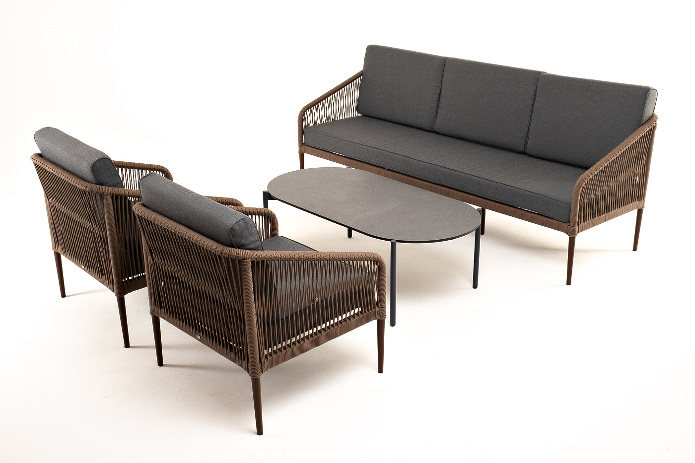 Каркас дивана и кресел выполнен из прочного алюминия с порошковым покрытием коричневый муар (RAL8016). Он оплетен вручную коричневым роупом. Подушки из полиэстера темно-серого цвета (027). Столик «Верона» имеет черный муаровый каркас и столешницу из HPL «серый гранит».
