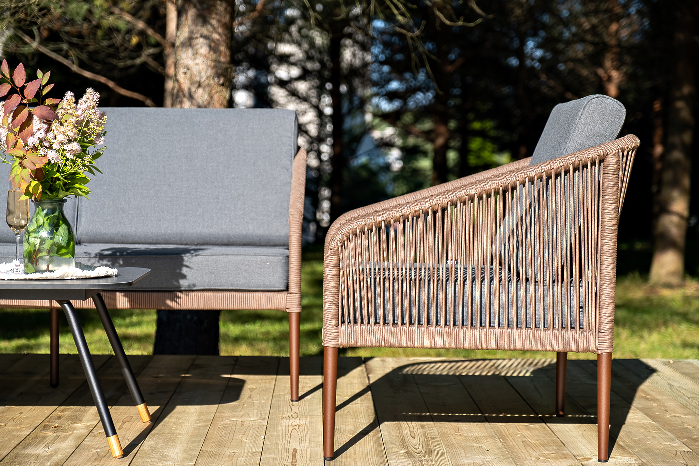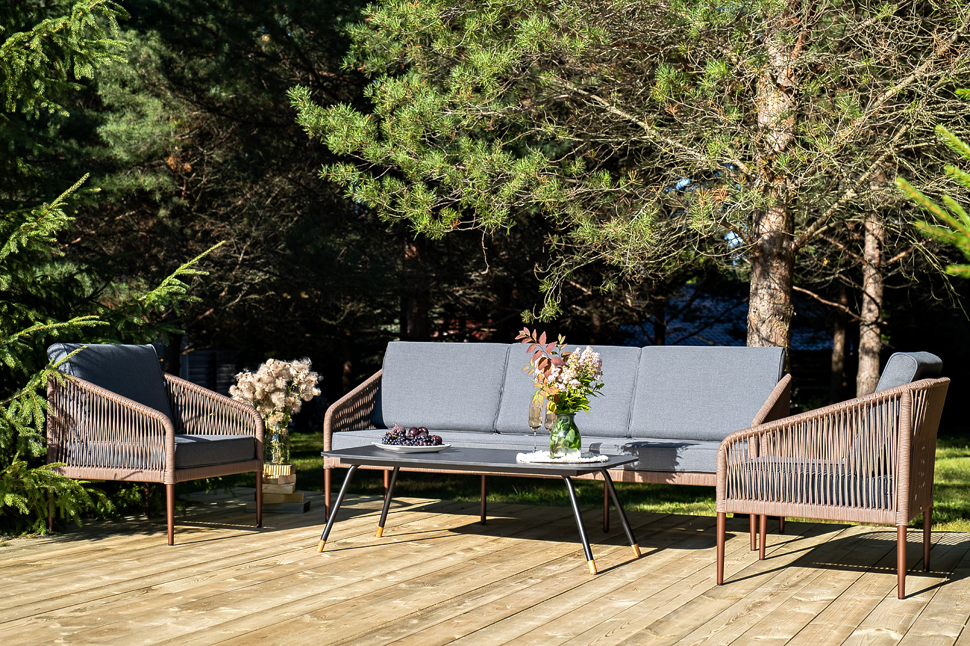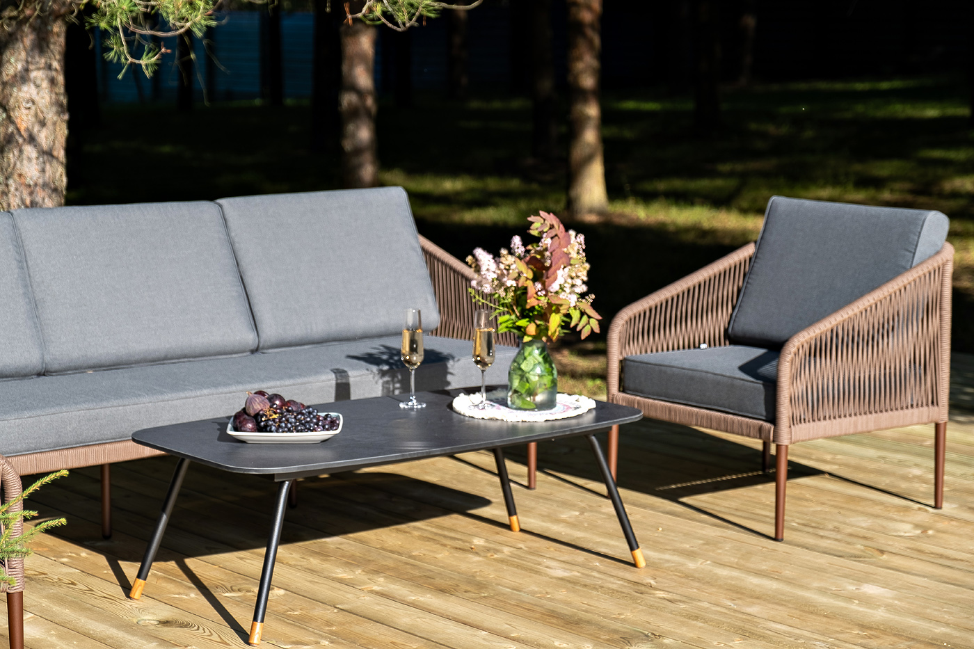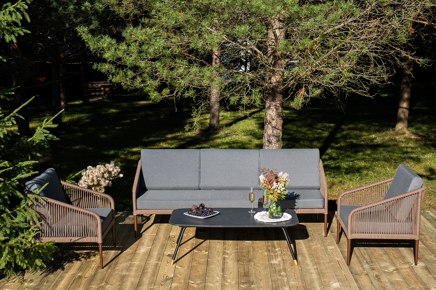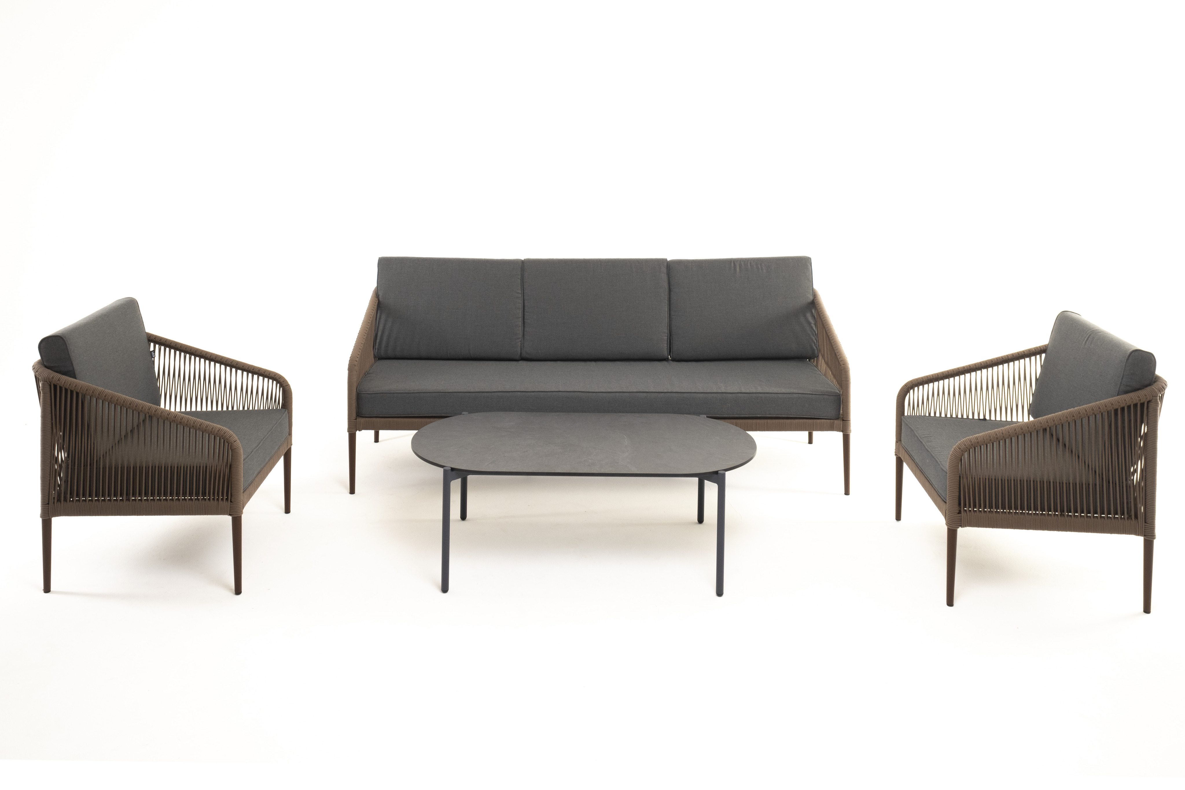 Каркас дивана и кресел выполнен из прочного алюминия с порошковым покрытием коричневый муар (RAL8016). Он оплетен вручную коричневым роупом. Подушки из полиэстера темно-серого цвета (027). Столик «Верона» имеет черный муаровый каркас и столешницу из HPL «серый гранит».