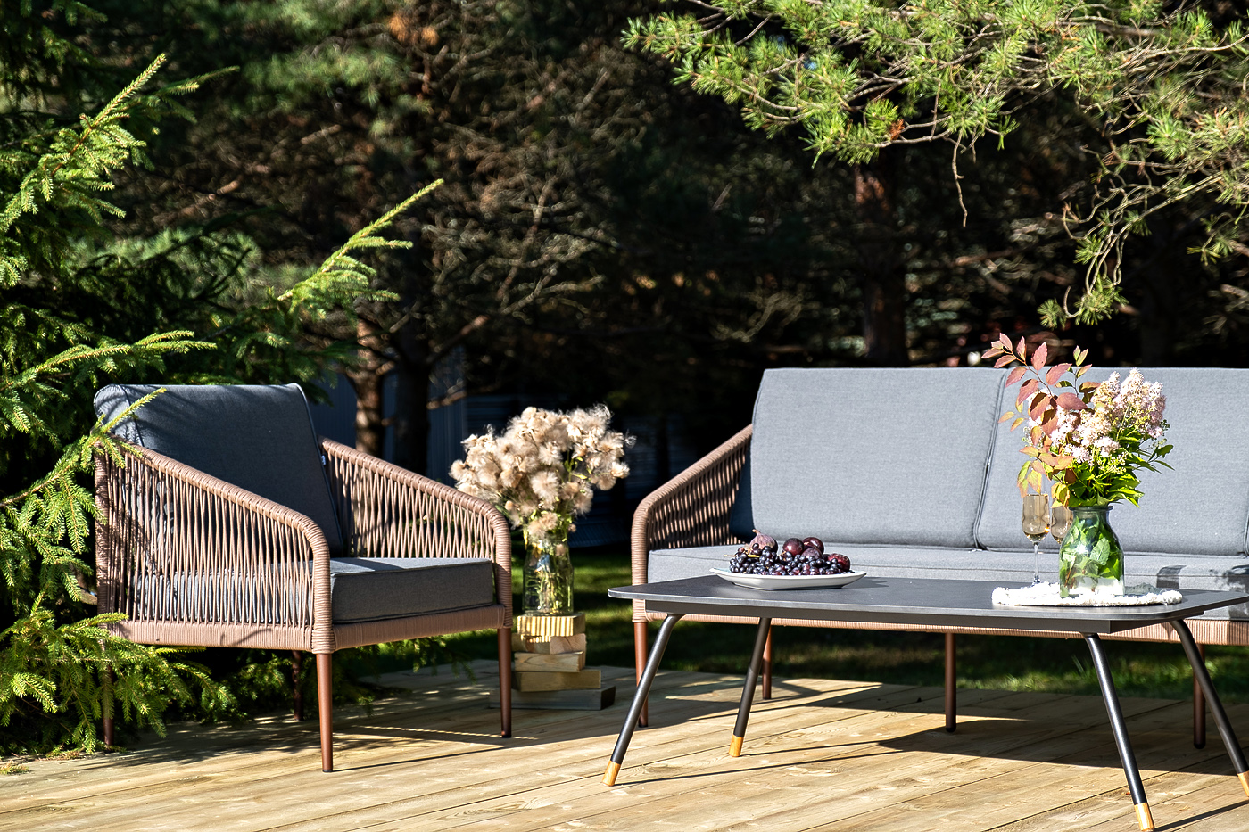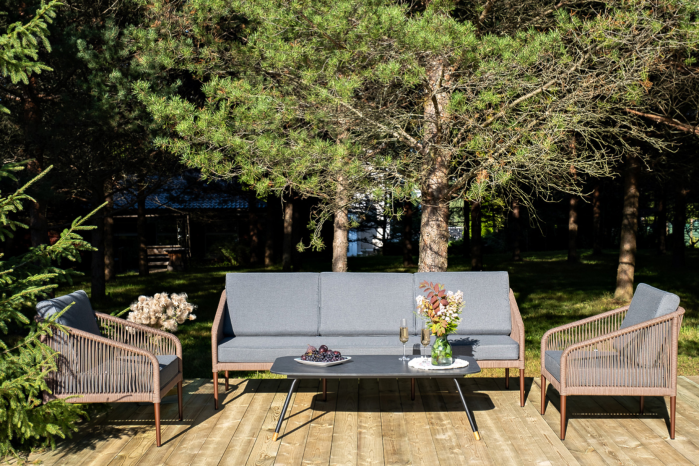 Лаунж-зона «Канны», рассчитанная на пять персон, станет центром притяжения для всей семьи и друзей. Комплект включает в себя просторный трехместный диван, два удобных кресла и журнальный столик. Прочный алюминиевый каркас с покрытием коричневый муар (RAL8016), оплетенный вручную коричневым роупом, создает надежную и эстетичную конструкцию. Мягкие подушки в темно-серых чехлах дарят непревзойденный комфорт. Журнальный столик «Верона» с черным каркасом и столешницей из HPL «серый гранит» идеально завершает этот гармоничный ансамбль.