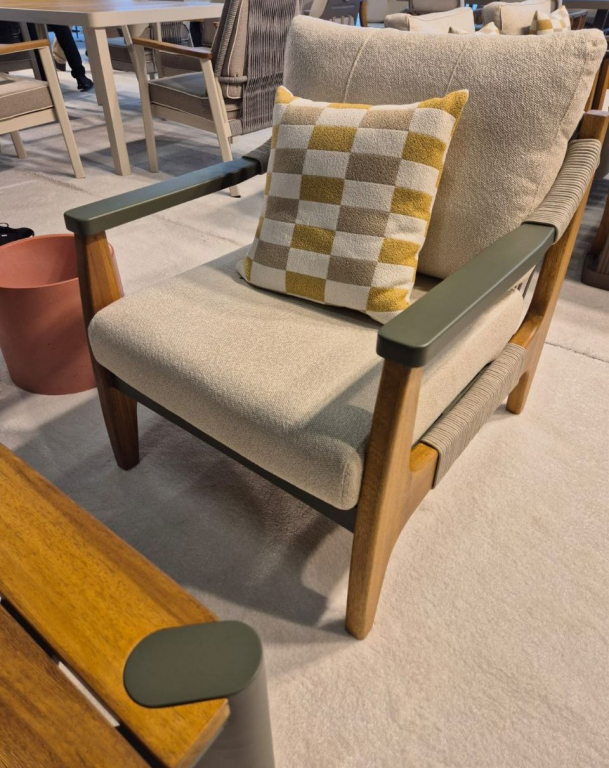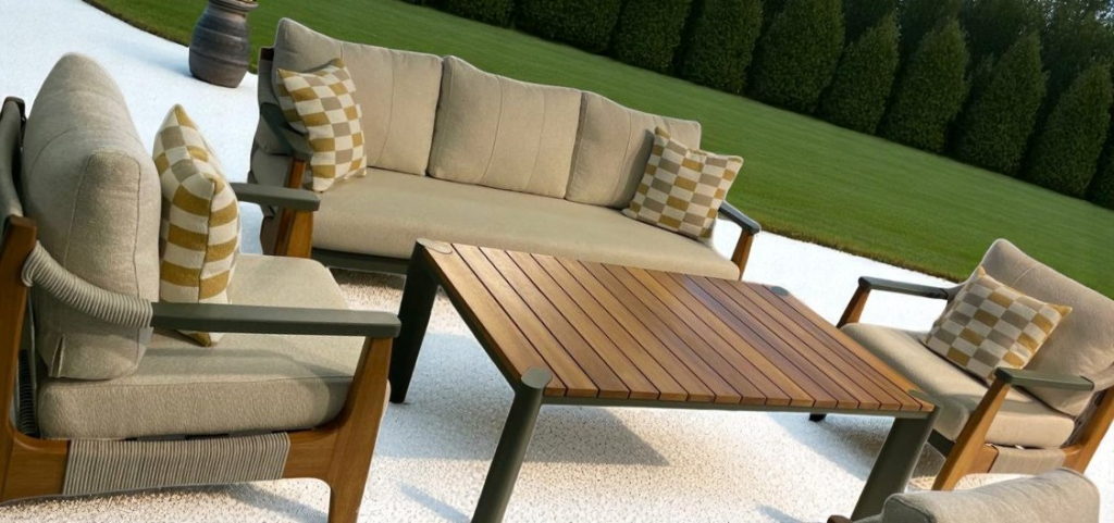 | Особенности | Сочетание алюминия, дерева и роупа, водонепроницаемые подушки, устойчивость к УФ и влаге, дерево ироко |